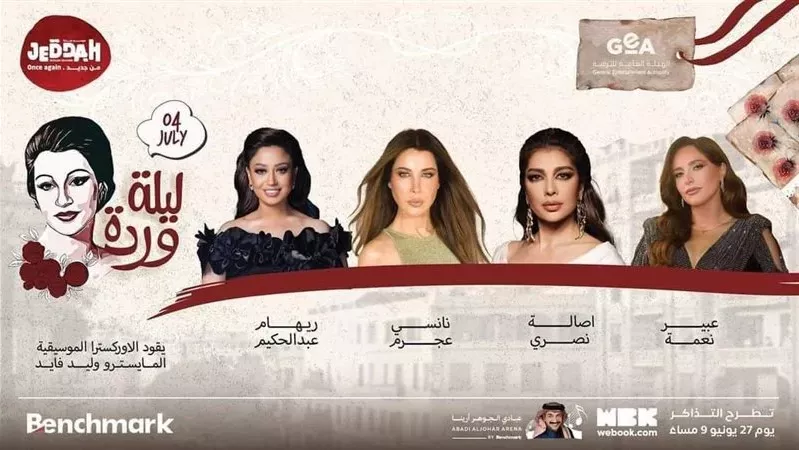 ويقام حفل ليلة وردة بالمملكة العربية السعودية في مدينة جدة ضمن فعاليات جدة 2024 وتحيي الحفل كل من نانسي عجرم وأصالة وريهام عبد الحكيم وعبير نعمة بقيادة المايسترو وليد فايد وعدد من العازفين ومن أبرزهم سعيد الأرتيست.