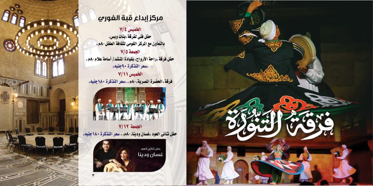 ويقيم مركز إبداع قبة الغورية بالتعاون مع الهيئة العامة لقصور الثقافة حفلًا لفرقة التنورة التراثية يومي السبت والأربعاء من كل أسبوع في تمام الساعة الـ 7:30 مساءً، بأسعار 15 جنيه للمصريين و90 جنيه للأجانب.