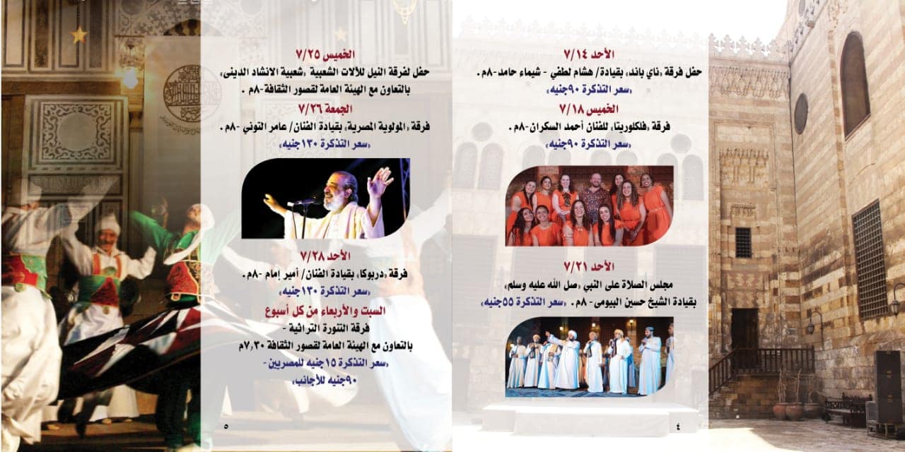 وتؤدي فرقة “المولوية المصرية” بقيادة الفنان عامر التوني يوم الجمعة الموافق 26 يوليو، في تمام الساعة الـ 8 مساءً، وذلك بـ 130 جنيه للتذكرة.