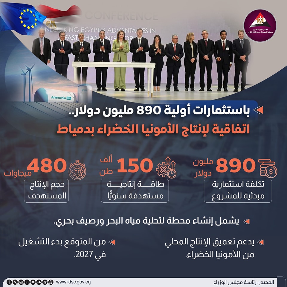 استثمارات بـ890 مليون دولار، تفاصيل اتفاقية إنتاج الأمونيا الخضراء بدمياط (إنفوجراف)