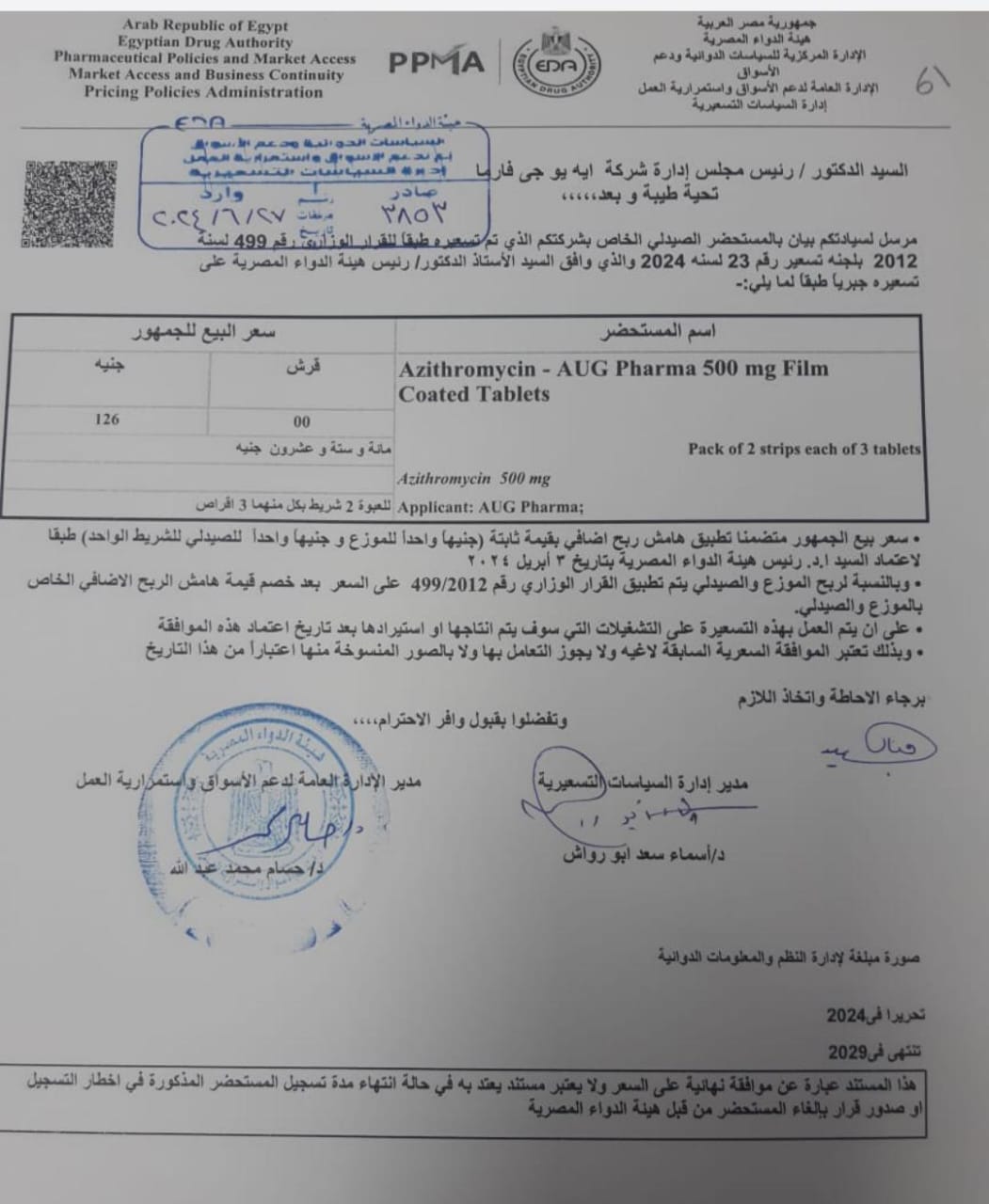 وافقت هيئة الدواء المصرية من خلال إدارة السياسات التسعيرية على زيادة سعر دواء ازيثرومايسين ٥٠٠ مجم للعبوة التى تحتوي على ٦ أقراص لسعر 126 جنيها بدلا من 65 جنيها.