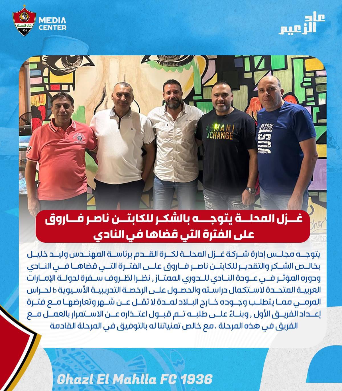 ونشرت الصفحة الرسمية لنادي غزل المحلة على موقع التواصل الاجتماعي فيسبوك “يتوجه مجلس إدارة شركة غزل المحلة لكرة القدم برئاسة المهندس وليد خليل بخالص الشكر والتقدير للكابتن ناصر فاروق على الفترة التي قضاها في النادي ودوره المؤثر في عودة النادي للدوري الممتاز”.