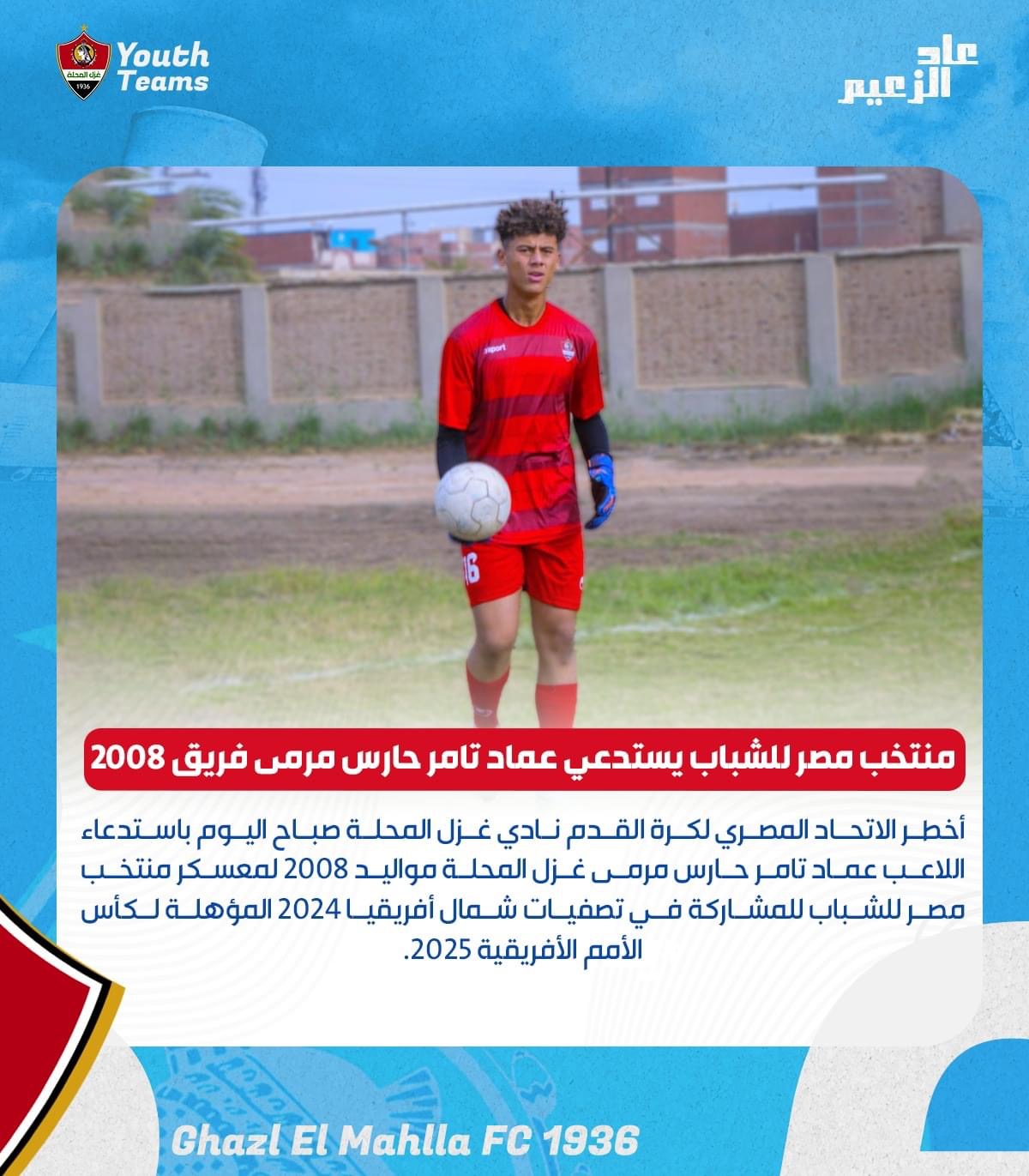 أعلن نادي غزل المحلة عن إخطار الاتحاد المصري لكرة القدم الفريق صباح اليوم باستدعاء اللاعب عماد تامر حارس مرمى غزل المحلة مواليد ٢٠٠٨ لمعسكر منتخب مصر للشباب للمشاركة في تصفيات شمال أفريقيا ٢٠٢٤ المؤهلة لكأس الأمم الأفريقية ٢٠٢٥.