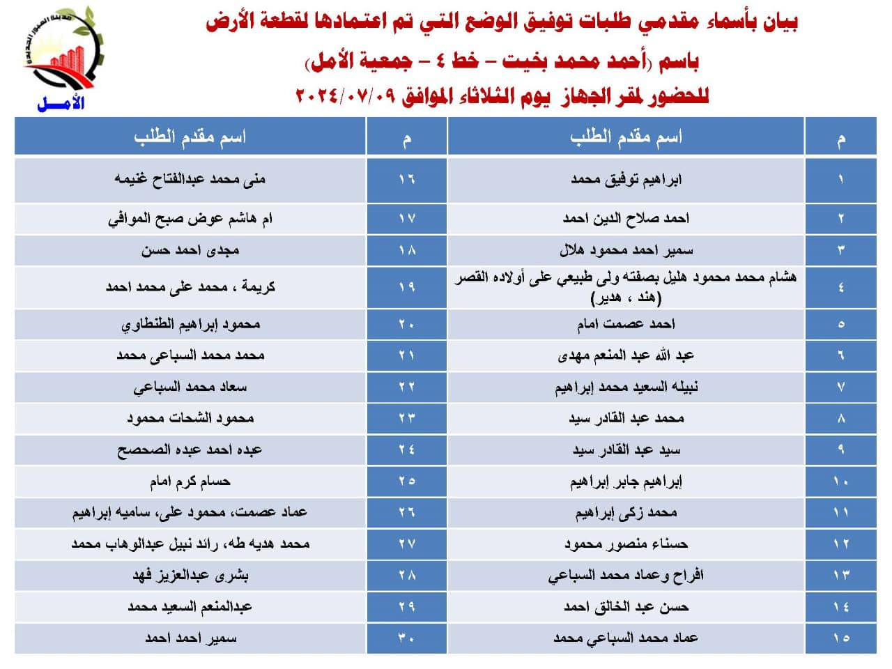 أعلن جهاز مدينة العبور الجديدة أسماء دفعة جديدة من المواطنين، الذين تم اعتماد توفيق الأوضاع لأراضيهم بمنطقة الأمل التابعة للمدينة.