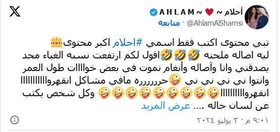 لكن أحلام ردَّت بشكل قاطع، وغردت قائلةً: "تبي محتوى اكتب فقط اسمي أحلام.. أكبر محتوى"، وتابعت قائلةً: "ليه أصالة ملحنة.. أقول لكم ارتفعت نسبة الغباء ما حد يصدقني".