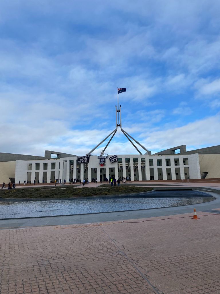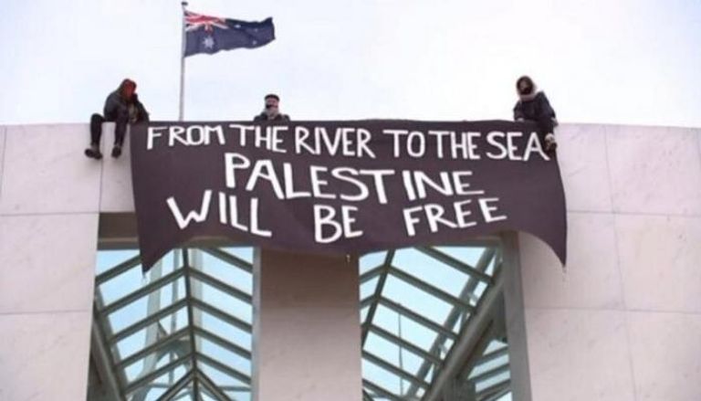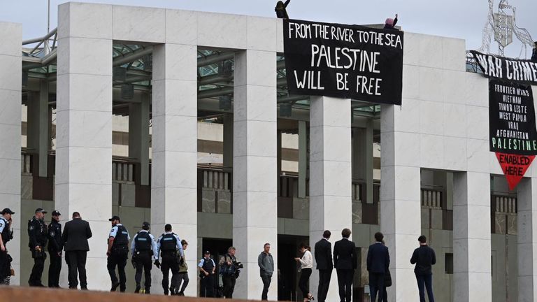 أظهرت لقطات تلفزيونية متظاهرين داعمين لغزة فوق سطح مبنى البرلمان الأسترالي في كانبيرا اليوم الخميس واتهموا إسرائيل بارتكاب جرائم حرب.