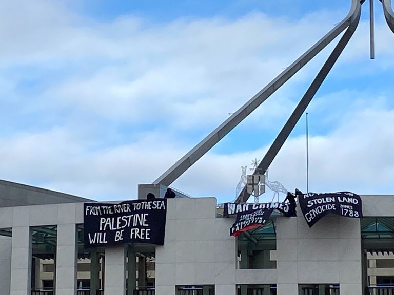 ملابس داكنة ولافتات سوداء، متظاهرون داعمون لغزة يحتلون سطح البرلمان الأسترالي (صور)