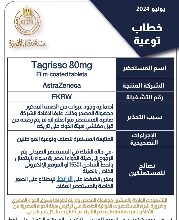 1- وجود عبوات مجهولة المصدر لمستحضر تاجريسو "Tagrisso 80mg" المستخدم في علاج سرطان الرئة تشغيلة رقم FKRM