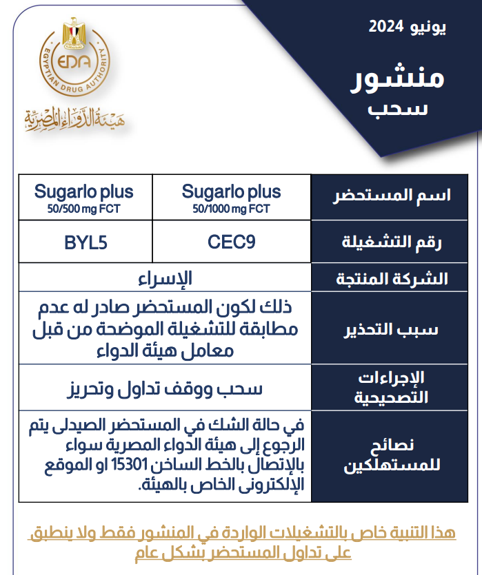 وأكدت هيئة الدواء المصرية أن التشغيلات تحمل رقم CEC9 لـ Sugarlo plus 50/1000 mg FCT والتشغيلة رقم BYL5 لـ Sugarlo plus 50/500 mg FCT لا تنطبق مع موافصات معامل هيئة الدواء المصرية