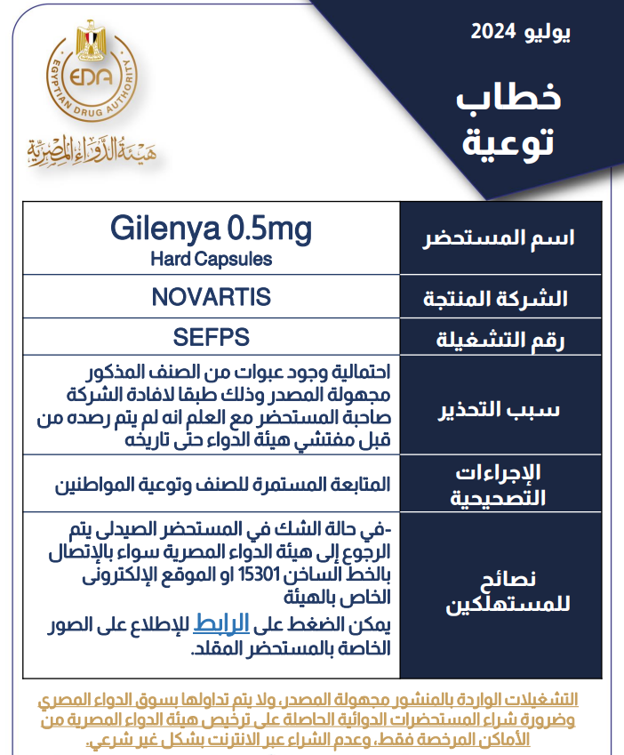 3- وجود عبوات مجهولة المصدر ومهربة لعقار جيلينيا "Gilenya 0.5mg"، ويستخدم لعلاج التهاب التصلب اللويحي المتعدد.