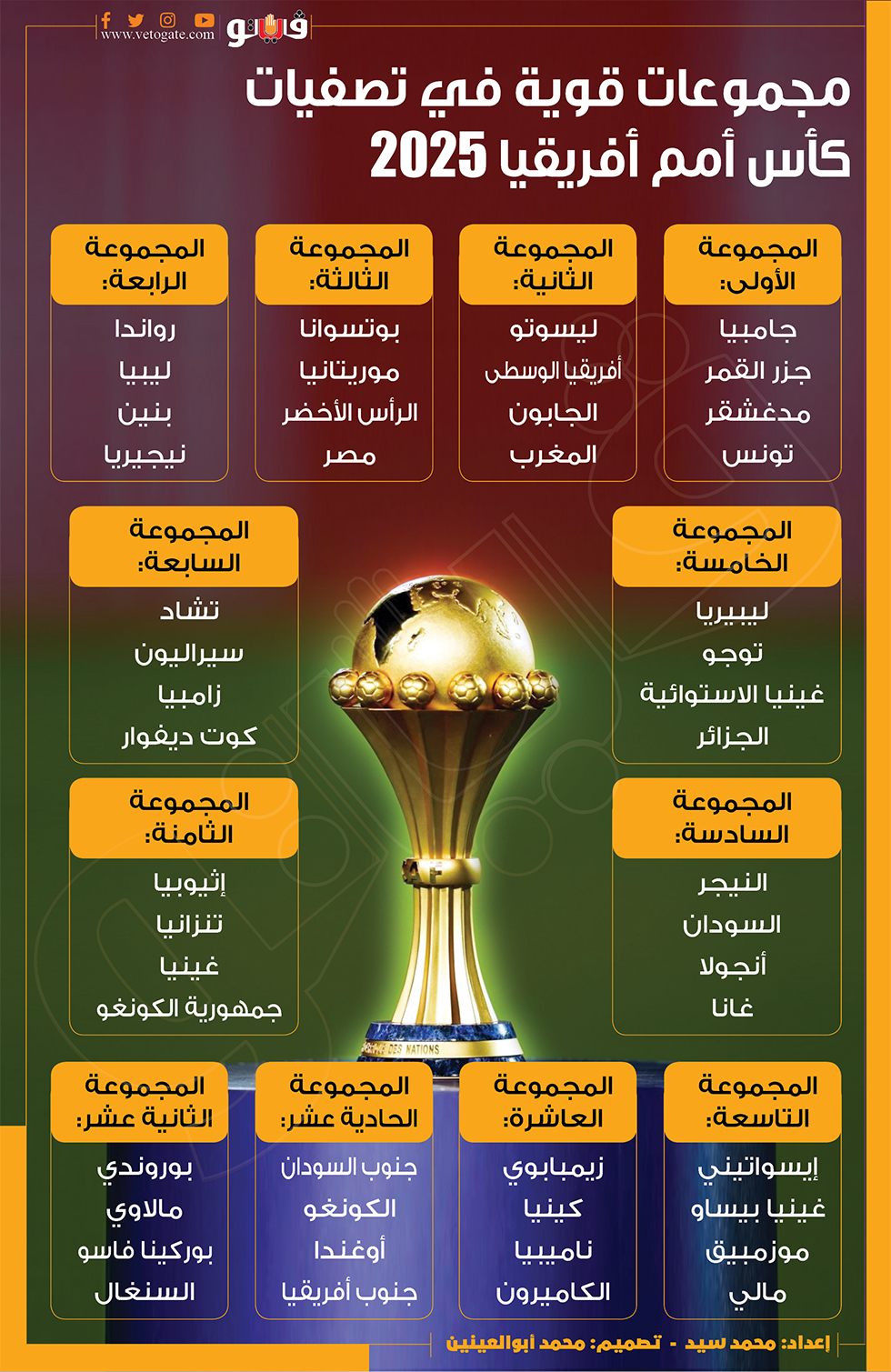 مجموعات قوية في تصفيات كأس أمم أفريقيا 2025 (إنفوجراف) الجمعة 05/يوليو/2024 - 10:49 ص 7/5/2024 10:49:30 AM كأس أمم أفريقيا، فيتو محمد سيد شارك طباعة 18 حجم الخط شارك طباعة تصفيات كأس أمم أفريقيا 2025 تصفيات كأس أمم أفريقيا كأس أمم أفريقيا أمم إفريقيا