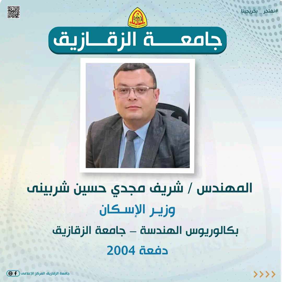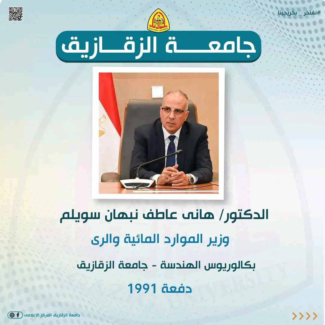 وهنأت الجامعة كلا من:- الدكتور هانى عاطف نبهان سويلم وزير الموارد المائية والرى بكالوريوس الهندسة - جامعة الزقازيق دفعة 1991 والمهندس شريف مجدي حسين شربينى وزير الإسكان بكالوريوس الهندسة – جامعة الزقازيق دفعة 2004.