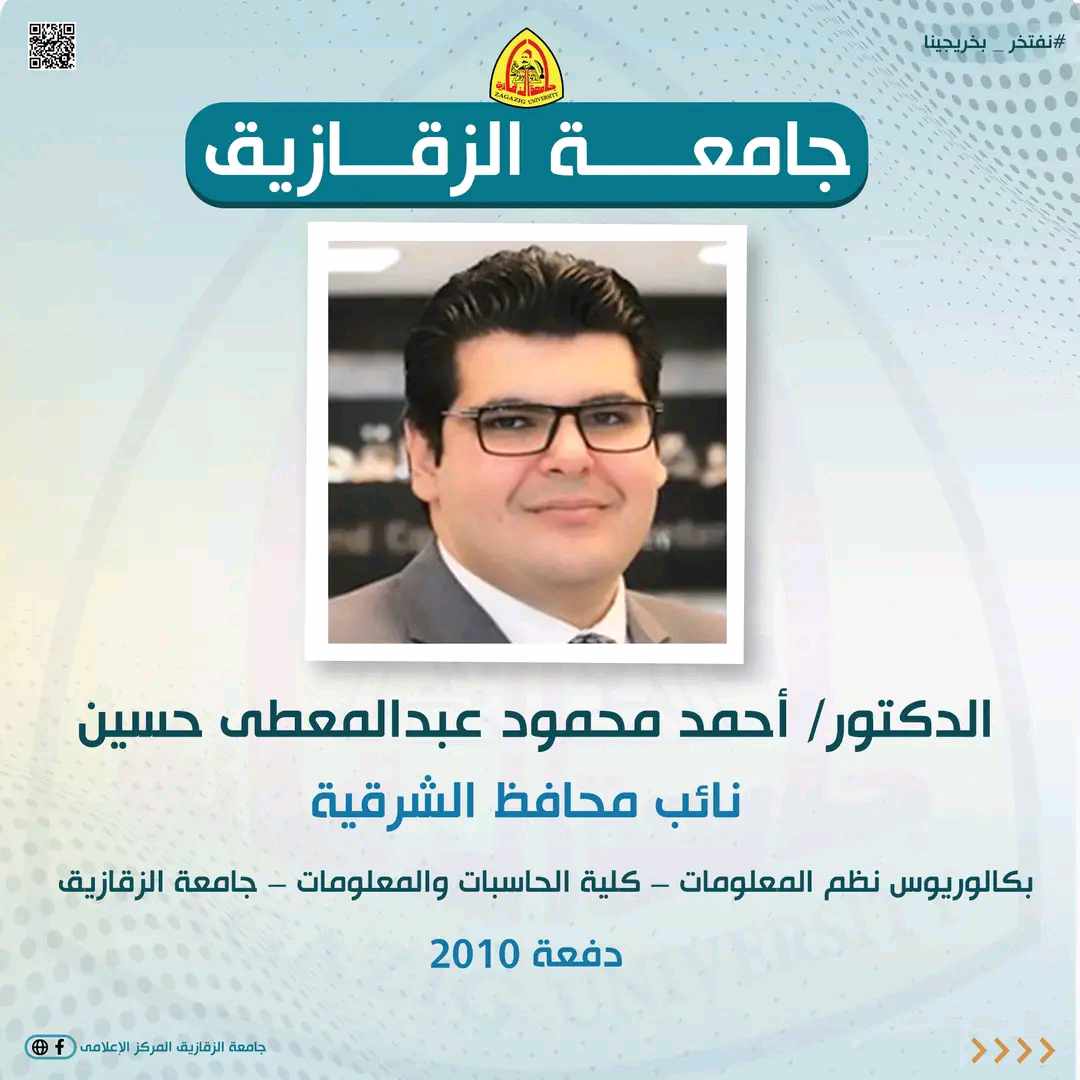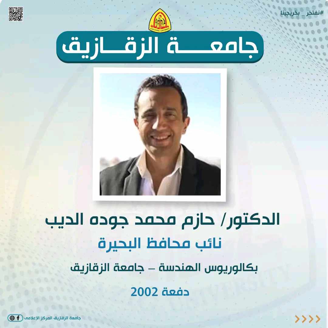 بالإضافة إلى نواب المحافظين وهم كل من:- الدكتور أحمد محمود عبد المعطى حسين نائب محافظ الشرقية بكالوريوس نظم المعلومات – كلية الحاسبات والمعلومات – جامعة الزقازيق دفعة 2010 والمهندسة لبنى عبد العزيز حبيب السيد نائب محافظ الشرقية بكالوريوس الهندسة – جامعة الزقازيق دفعة 1998 والدكتور حازم محمد جوده الديب نائب محافظ البحيرة بكالوريوس الهندسة – جامعة الزقازيق دفعة 2002.