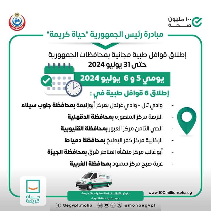 أعلنت وزارة الصحة إطلاق ٦ قوافل طبية ضمن مبادرة رئيس الجمهورية حياة كريمة