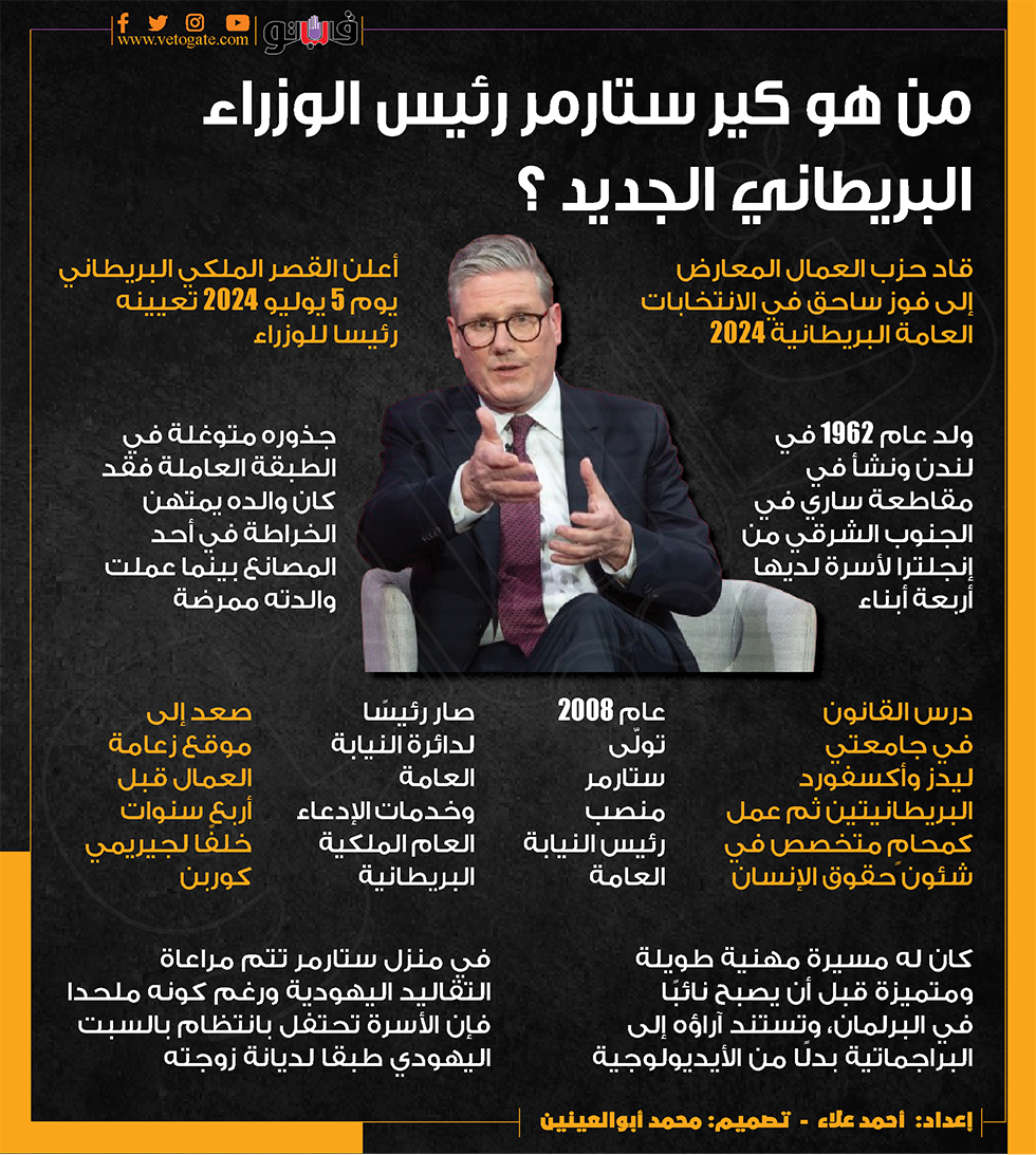 من هو كير ستارمر رئيس الوزراء البريطاني الجديد؟ (إنفوجراف) الجمعة 05/يوليو/2024 - 05:24 م 7/5/2024 5:24:56 PM كير ستارمر، فيتو احمد علاء شارك طباعة 18 حجم الخط شارك طباعة كير ستارمر رئيس الوزراء البريطاني حزب العمال الانتخابات العامة البريطانية 2024 القصر الملكي البريطاني بريطانيا