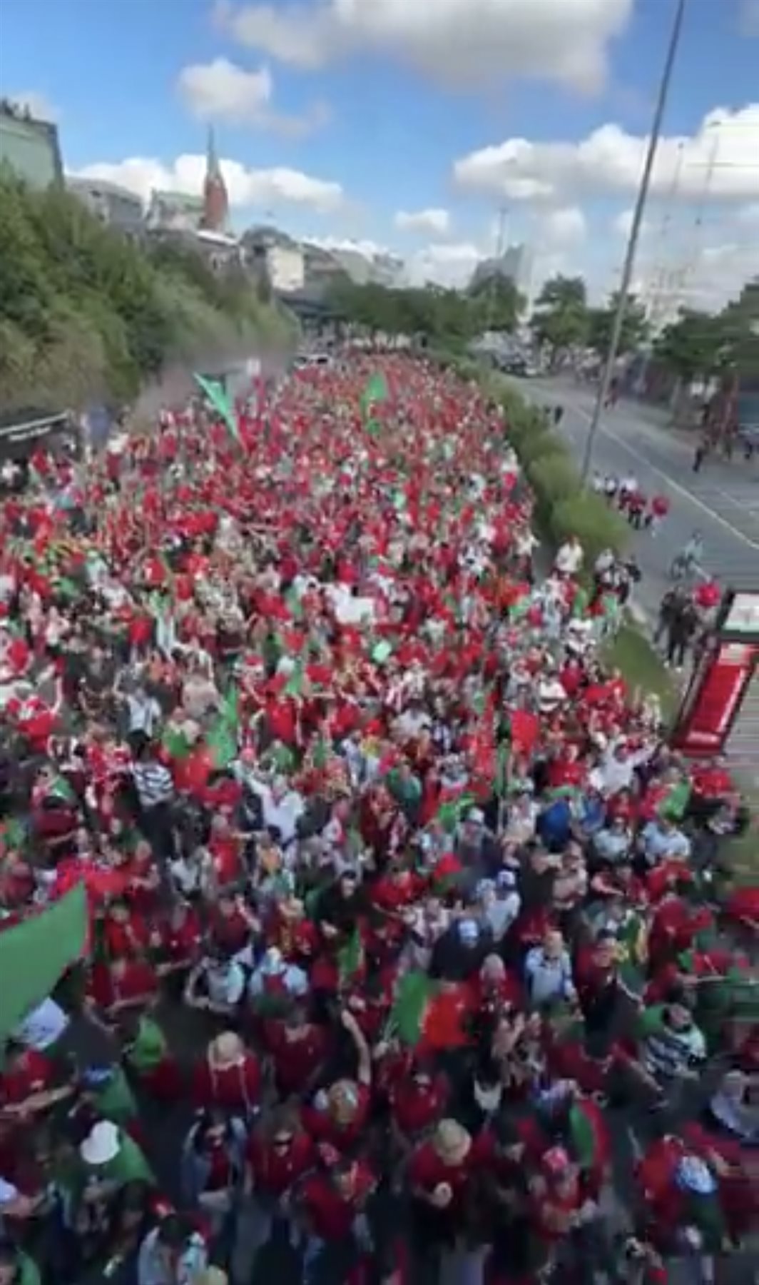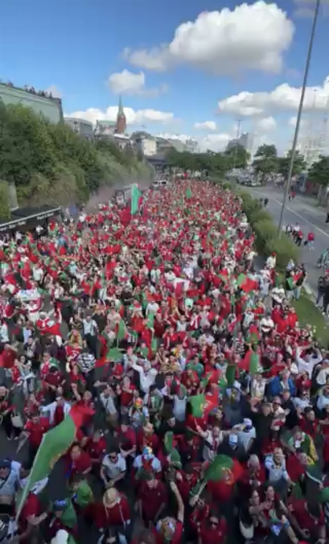 تداول رواد موقع التواصل الاجتماعي "إكس" مقطع فيديو لأعداد كبيرة من جماهير منتخب البرتغال أثناء التوجه لملعب فولكس بارك بمدينة هامبورج الألمانية، لمؤازرة منتخب بلادها في مباراته أمام منتخب فرنسا، المقرر لها ضمن الدور ربع النهائي من بطولة أمم أوروبا يورو 2024.