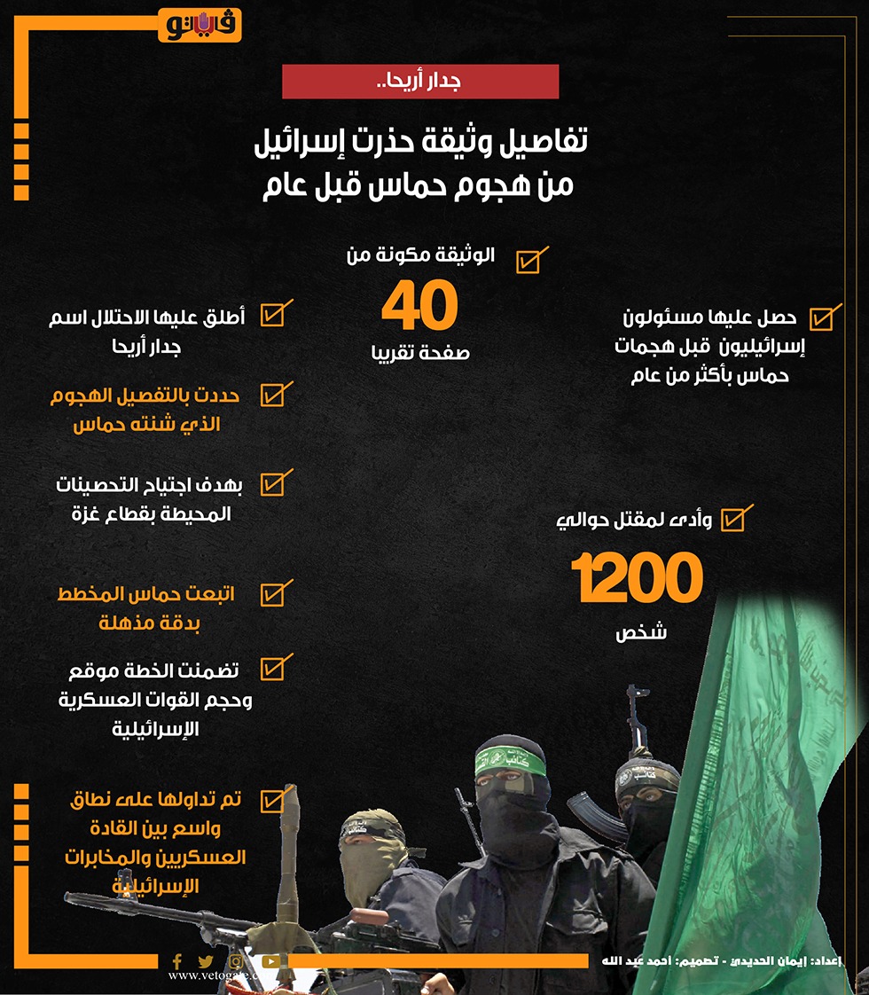 جدار أريحا.. تفاصيل وثيقة حذرت إسرائيل من هجوم حماس قبل عام (إنفوجراف) الأحد 07/يوليو/2024 - 07:31 م 7/7/2024 7:31:17 PM حماس، فيتو إيمان الحديدى شارك طباعة 18 حجم الخط شارك طباعة إسرائيل أريحا جدار اريحا مسؤولين إسرائيليين حماس غزة