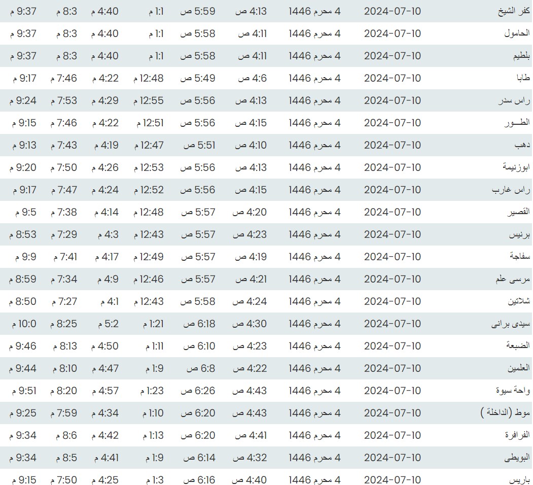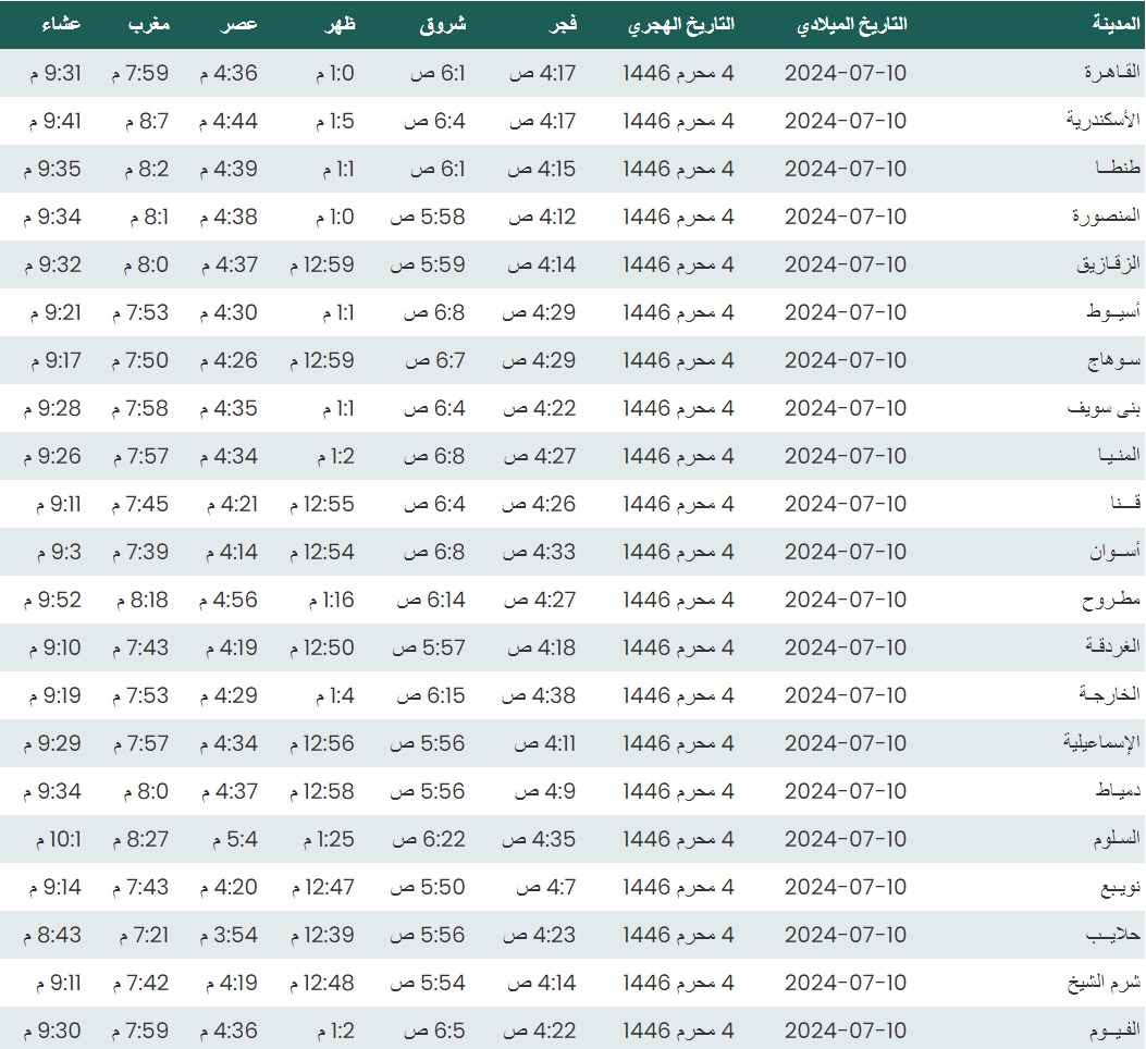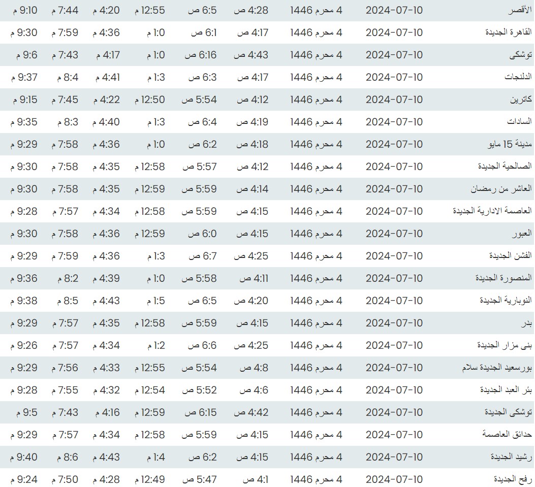 وفيما يلي مواقيت الصلاة، لعدد من مدن ومحافظات الجمهورية من واقع بيانات الهيئة العامة للمساحة