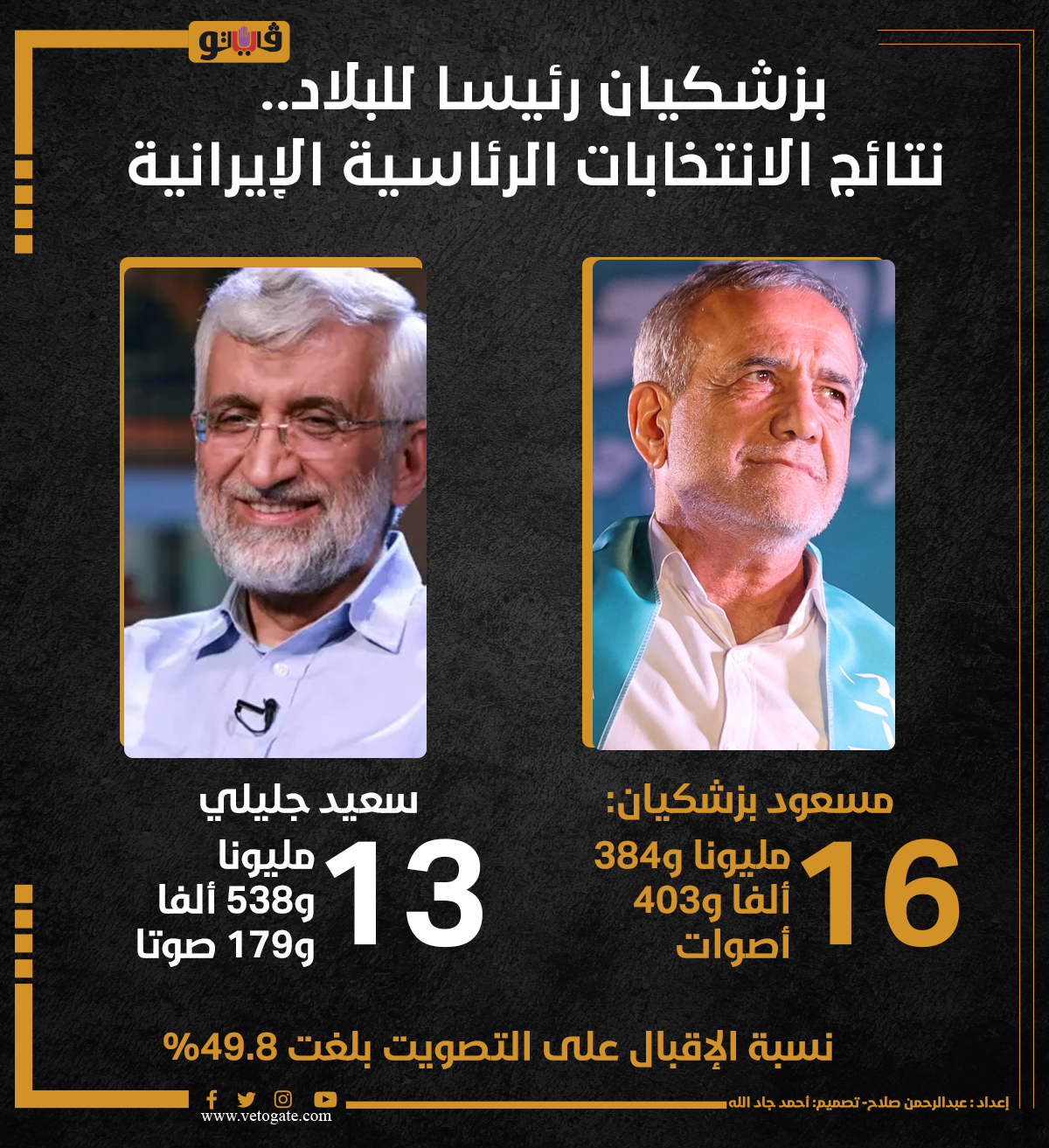 بزشكيان رئيسا للبلاد.. نتائج الانتخابات الرئاسية الإيرانية (انفوجراف) السبت 06/يوليو/2024 - 02:16 م 7/6/2024 2:16:08 PM الانتخابات الإيرانية، فيتو عبدالرحمن صلاح شارك طباعة 18 حجم الخط شارك طباعة بزشكيان جليلي سعيد جليلي مسعود بزشكيان رئيس ايران الجديد الانتخابات الرئاسية الإيرانية