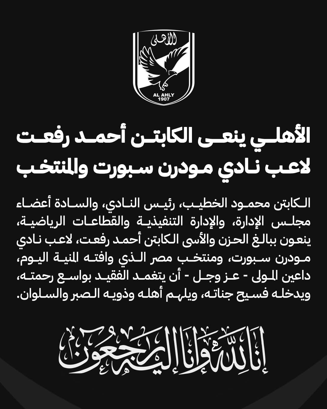 وتقدم مجلس إدارة النادي الأهلي بخالص العزاء لأسرة الراحل وكافة محبيه وجماهيره، سائلين المولى عزّ وجل أن يتغمده بواسع رحمته وأن يسكنه فسيح جناته ويلهم أهله وذويه الصبر والسلوان.