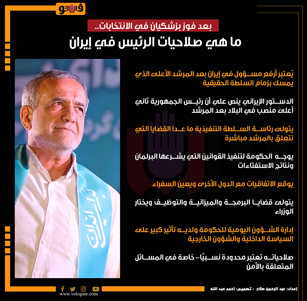 بعد فوز بزشكيان في الانتخابات.. ما هي صلاحيات الرئيس في إيران (انفوجراف) الأحد 07/يوليو/2024 - 12:29 م 7/7/2024 12:29:51 PM بزشكيان، فيتو عبدالرحمن صلاح شارك طباعة 18 حجم الخط شارك طباعة المرشد الاعلي إيران الدستور الايراني الرئيس الإيراني طهران الانتخابات الرئاسية الإيرانية الإنتخابات الإيرانية بزشكيان