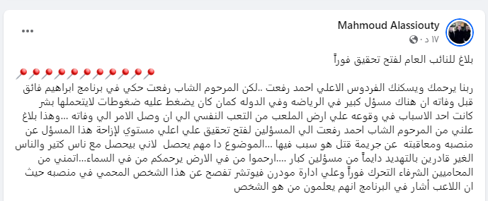 وكتب رئيس نادي لافيينا عبر صفحته علي موقع التواصل الاجتماعي فيس بوك: "بلاغ للنائب العام لفتح تحقيق فورًا، ربنا يرحمك ويسكنك الفردوس الأعلى أحمد رفعت..لكن المرحوم الشاب رفعت حكى في برنامج ابراهيم فايق قبل وفاته أن هناك مسؤول كبير في الرياضة وفي الدولة كمان كان يضغط عليه ضغوطات لا يتحملها بشر كانت أحد الأسباب في وقوعه على أرض الملعب من التعب النفسي إلى أن وصل الأمر إلى وفاته".