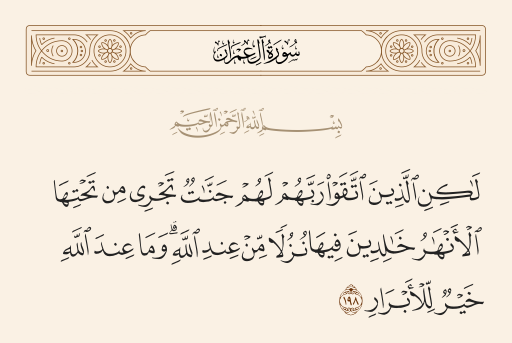 قال تعالى: «لَكِنِ الَّذِينَ اتَّقَوْا رَبَّهُمْ لَهُمْ جَنَّاتٌ تَجْرِي مِنْ تَحْتِهَا الْأَنْهَارُ خَالِدِينَ فِيهَا نُزُلًا مِنْ عِنْدِ اللَّهِ وَمَا عِنْدَ اللَّهِ خَيْرٌ لِلْأَبْرَارِ».