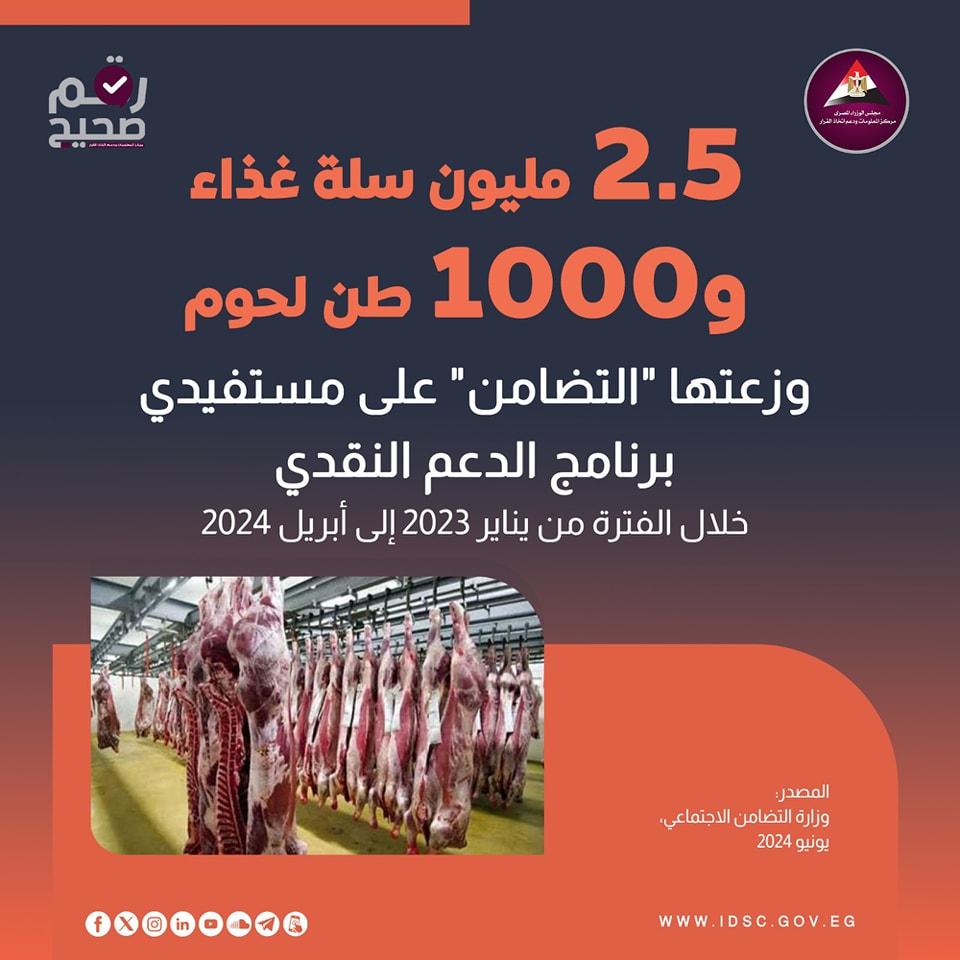 سلط مركز المعلومات ودعم اتخاذ القرار بمجلس الوزراء الضوء على قيام وزارة التضامن الاجتماعي بتوزيع 2.5 مليون سلة غذاء و1000 طن لحوم على مستفيدي برنامج الدعم النقدي، وذلك بالتعاون مع وزارة الأوقاف، خلال الفترة من يناير 2023 إلى أبريل 2024.