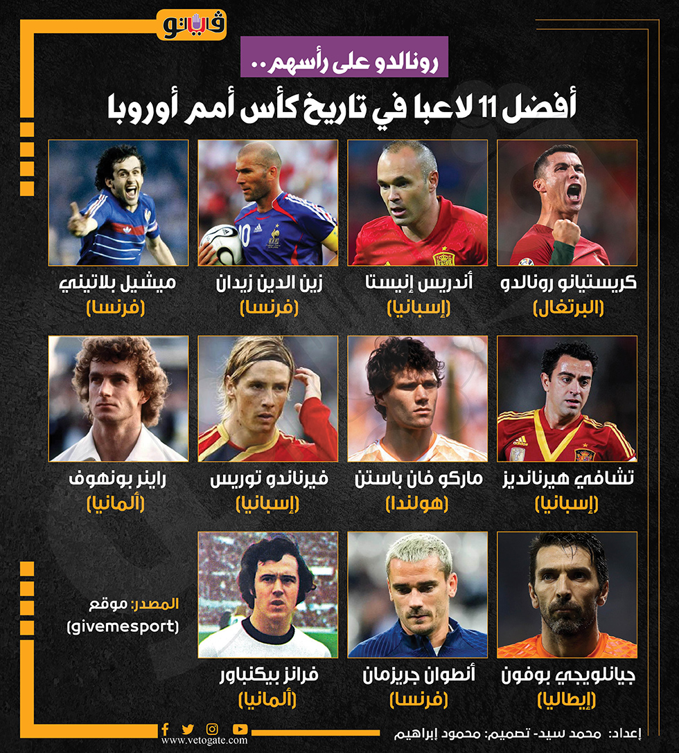 رونالدو على رأسهم.. أفضل 11 لاعبا في تاريخ كأس أمم أوروبا (إنفوجراف) السبت 13/يوليو/2024 - 12:53 م 7/13/2024 12:53:51 PM كريستيانو رونالدو، فيتو محمد سيد شارك طباعة 18 حجم الخط شارك طباعة كاس امم اوروبا أمم أوروبا كريستيانو رونالدو بوفون زين الدين زيدان بيكنباور بلاتيني