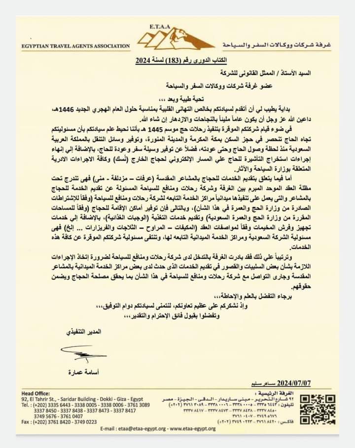 وأشارت إلى أن توفير أماكن الإقامة للحجاج وفقًا للمساحات المقررة من وزارة الحج والعمرة السعودية وتقديم خدمات التغذية الوجبات الغذائية، بالإضافة إلى خدمات تجهيز وفرش المخيمات وفقًا لمواصفات العقد المكيفات - المراوح - الثلاجات والفريزارات... إلخ) فهي مسئولية الشركة السعودية ومراكز الخدمة الميدانية التابعة لها، وأن شركات السياحة غير مسئولية عن كافة هذه الخدمات.