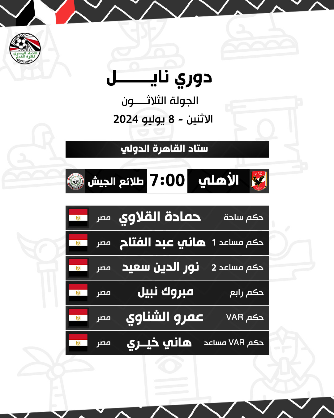 أبرزها الأهلي ضد طلائع الجيش، حكام مباريات اليوم في الدوري المصري