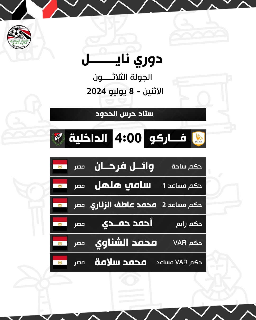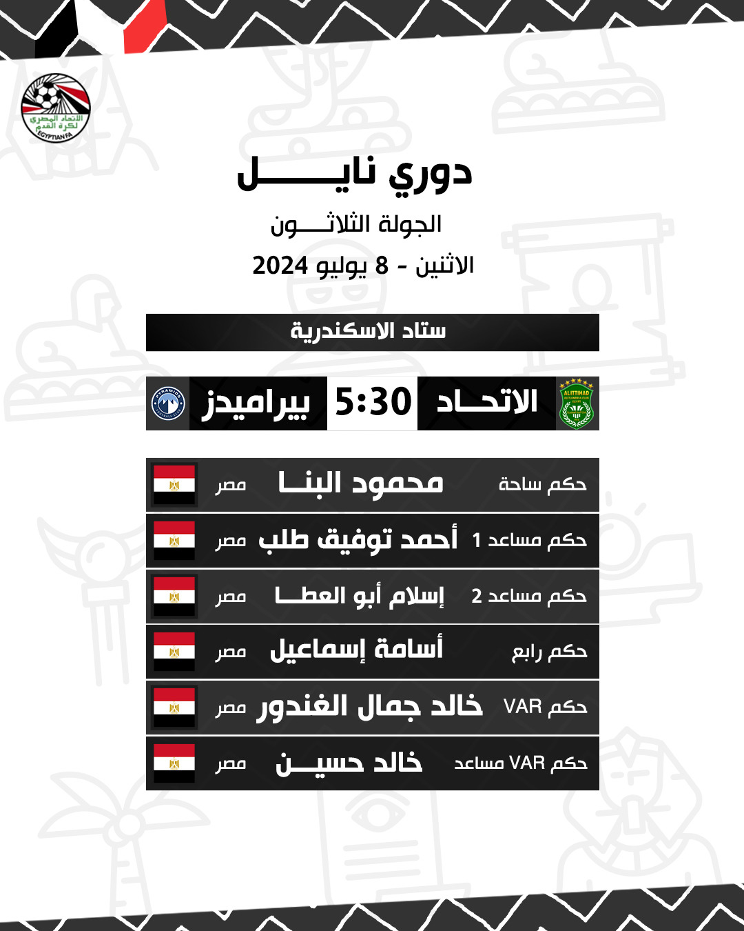 الدوري المصري، أعلنت لجنة الحكام الرئيسية باتحاد الكرة، أسماء حكام مباريات اليوم الإثنين، ضمن مواجهات الجولة الثلاثين من الدوري المصري الممتاز، وجاءت على النحو التالي: