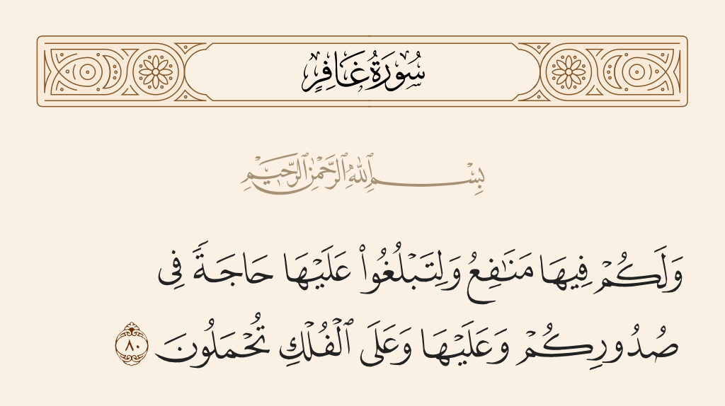 قال تعالى: «اللَّهُ الَّذِي جَعَلَ لَكُمُ الْأَنْعامَ لِتَرْكَبُوا مِنْها وَمِنْها تَأْكُلُونَ (٧٩) وَلَكُمْ فِيها مَنافِعُ وَلِتَبْلُغُوا عَلَيْها حاجَةً فِي صُدُورِكُمْ وَعَلَيْها وَعَلَى الْفُلْكِ تُحْمَلُونَ (٨٠)».