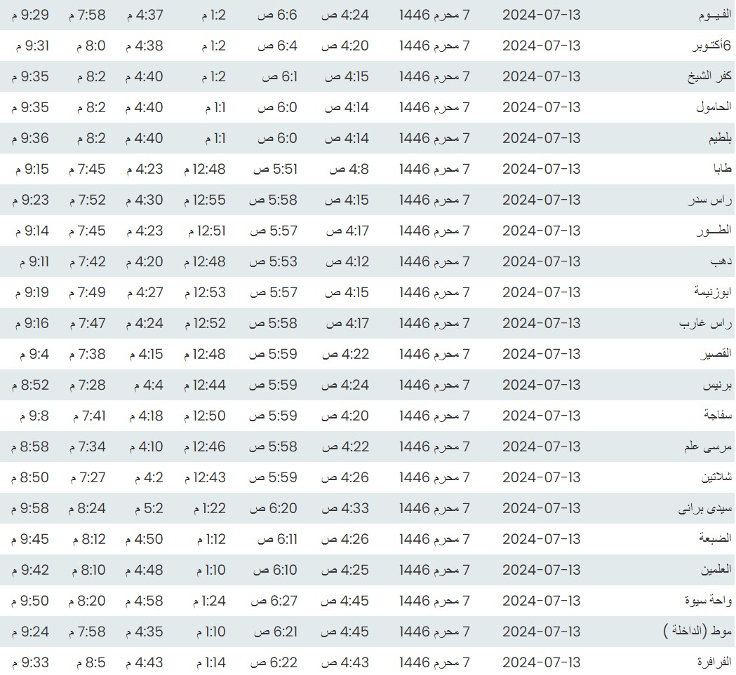 مواقيت الصلاة اليوم وفقًا للتوقيت المحلي لمدينتي القاهرة والإسكندرية وكذلك،مواقيت الصلاة، لعدد من مدن ومحافظات الجمهورية من واقع بيانات الهيئة العامة للمساحة