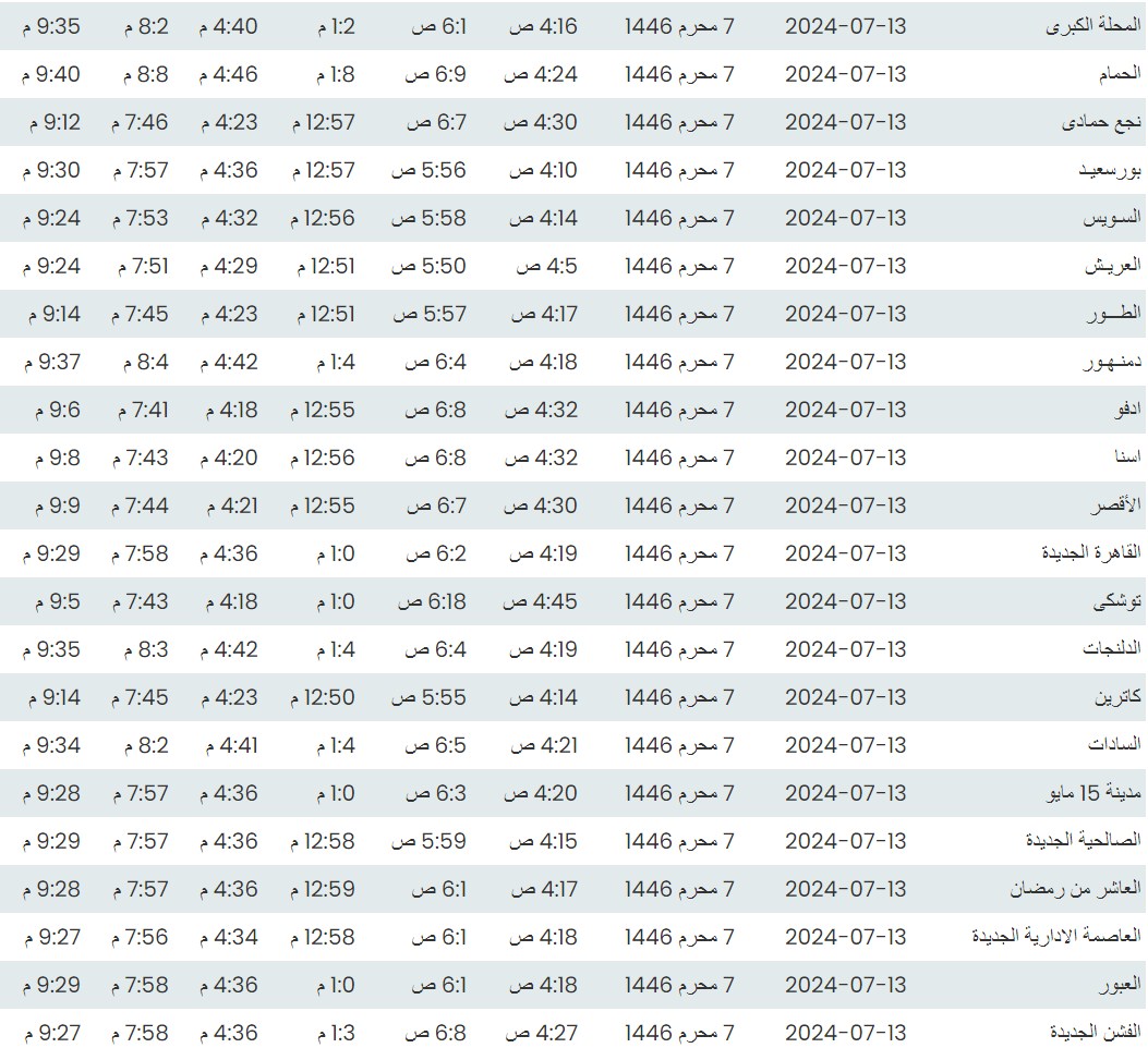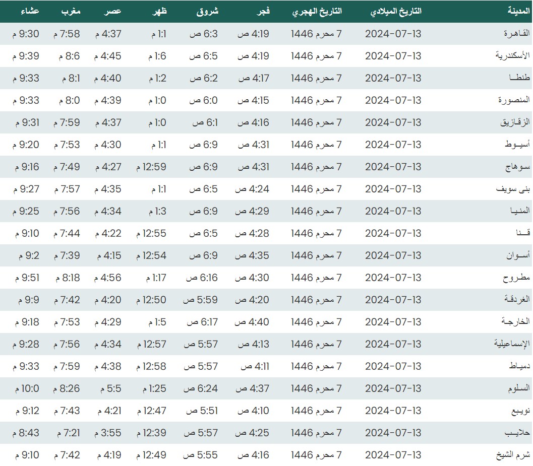 مواقيت الصلاة اليوم وفقًا للتوقيت المحلي لمدينتي القاهرة والإسكندرية وكذلك،مواقيت الصلاة، لعدد من مدن ومحافظات الجمهورية من واقع بيانات الهيئة العامة للمساحة