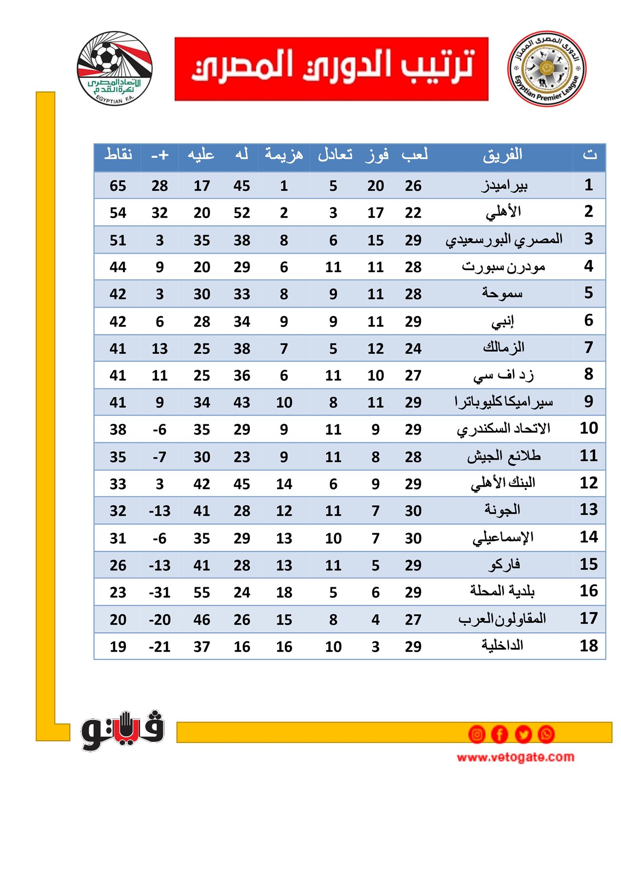 ويتصدر بيراميدز جدول ترتيب الدوري المصري الممتاز ويليه الأهلي في المركز الثاني قبل انطلاق المباريات الختامية للجولة الـ 30.