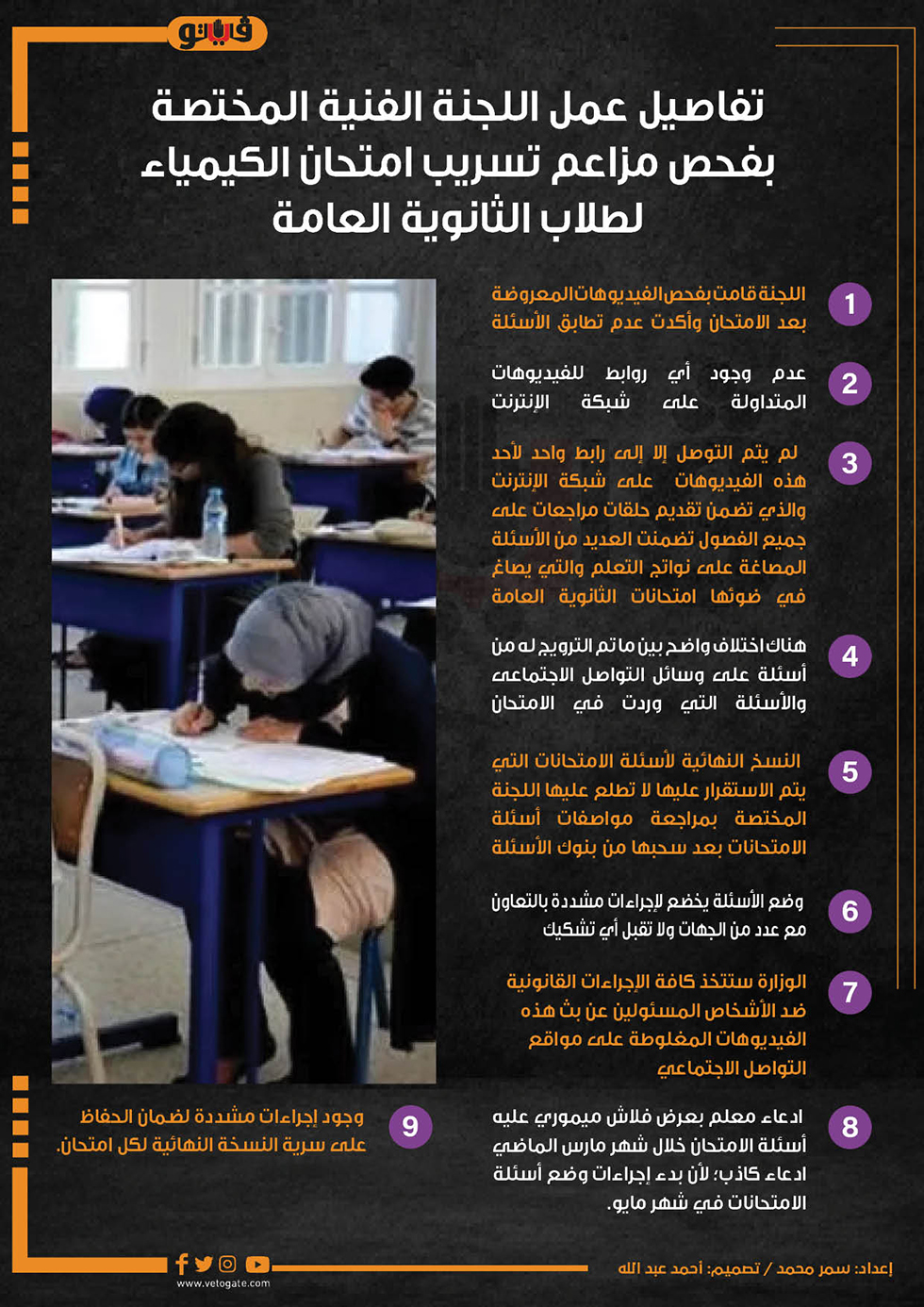 تفاصيل عمل اللجنة الفنية المختصة بفحص مزاعم تسريب امتحان الكيمياء لطلاب الثانوية العامة (انفوجراف) الإثنين 08/يوليو/2024 - 01:52 م 7/8/2024 1:52:58 PM امتحانات الثانوية العامة سمر محمد شارك طباعة 18 حجم الخط شارك طباعة تسريب امتحان الكيمياء امتحان الكيمياء الثانوية العامة