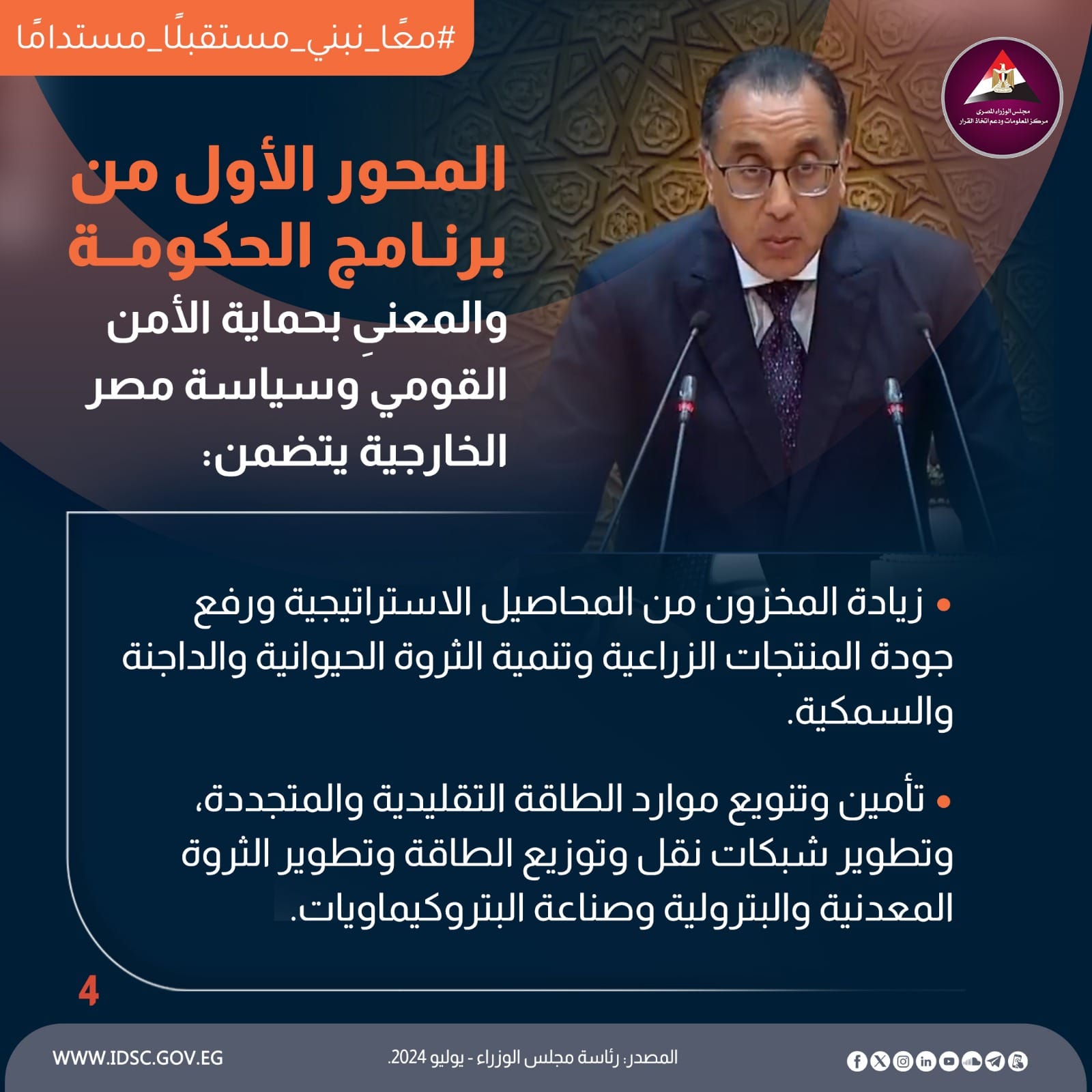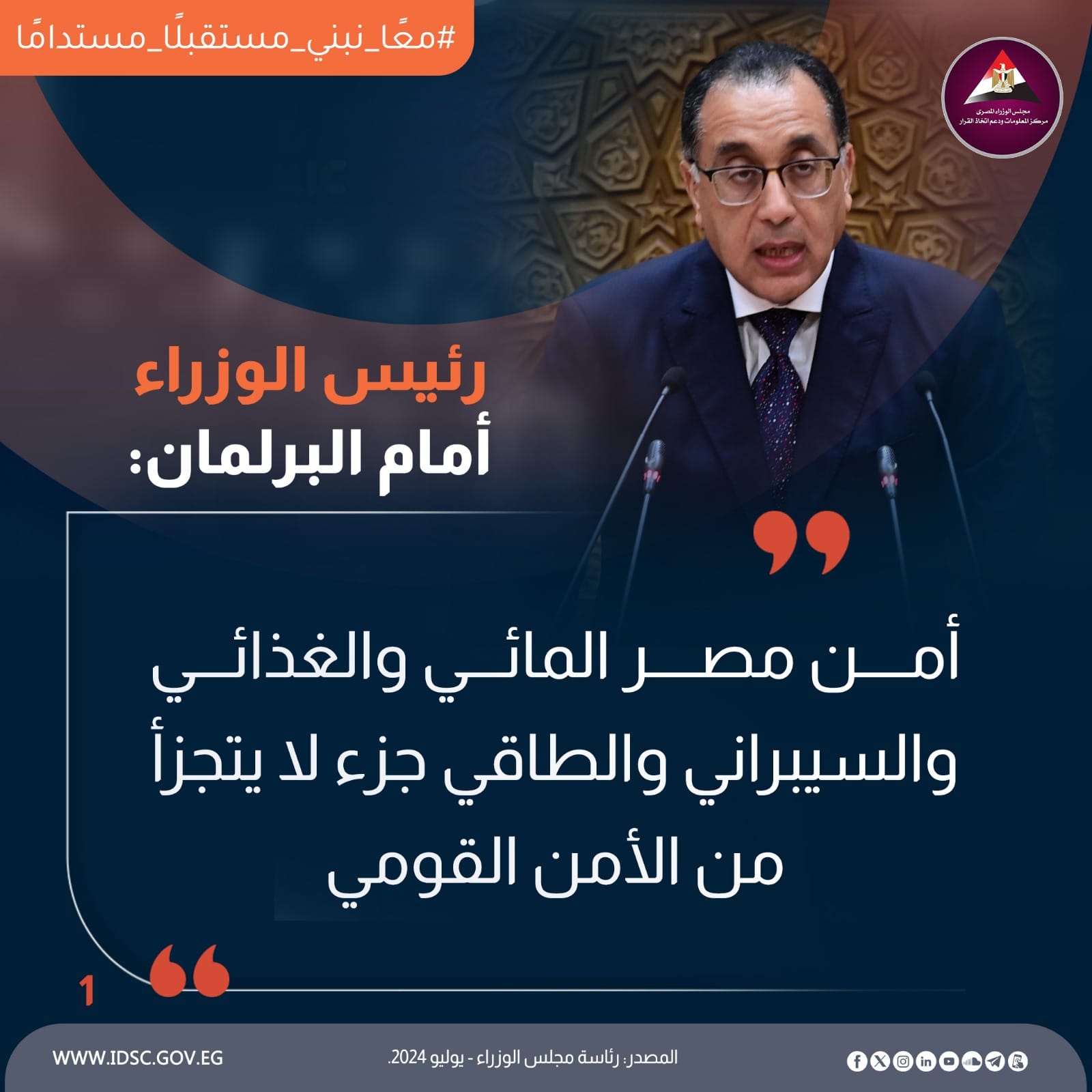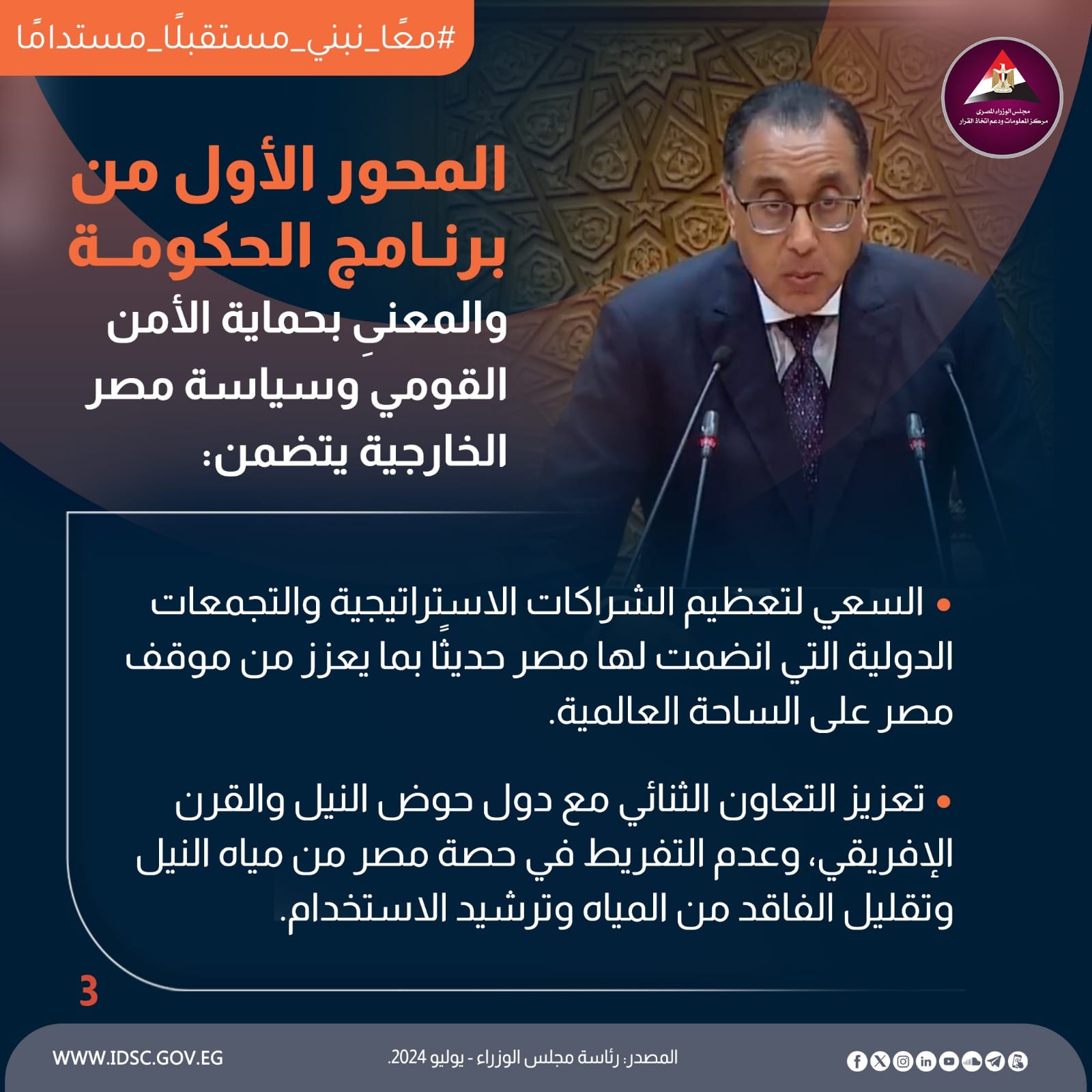 شدد الدكتور مصطفي مدبولي رئيس الوزراء على أنه باعتبار أمن مصر المائي، والأمن الغذائي، وأمن الطاقة، والأمن السيبراني، جزءًا لا يتجزأ من الأمن القومي؛ فإن المحور الرئيسي الأول من برنامج الحكومة يشمل العمل على تحقيق حماية أمن مصر المائي من خلال تعزيز التعاون الثنائي مع دول حوض النيل والقرن الإفريقي.
