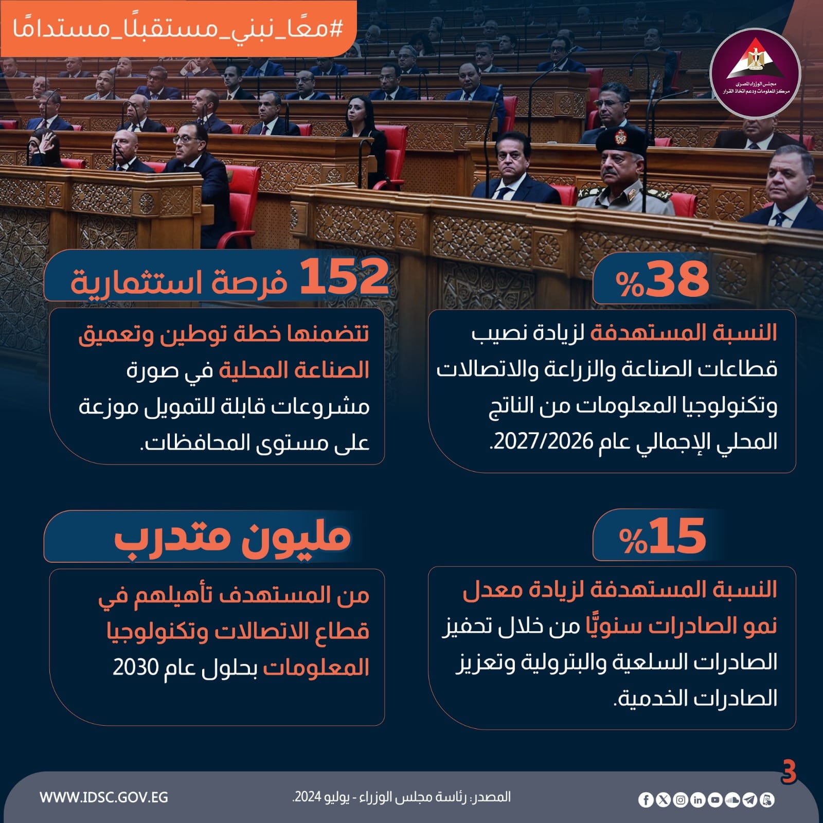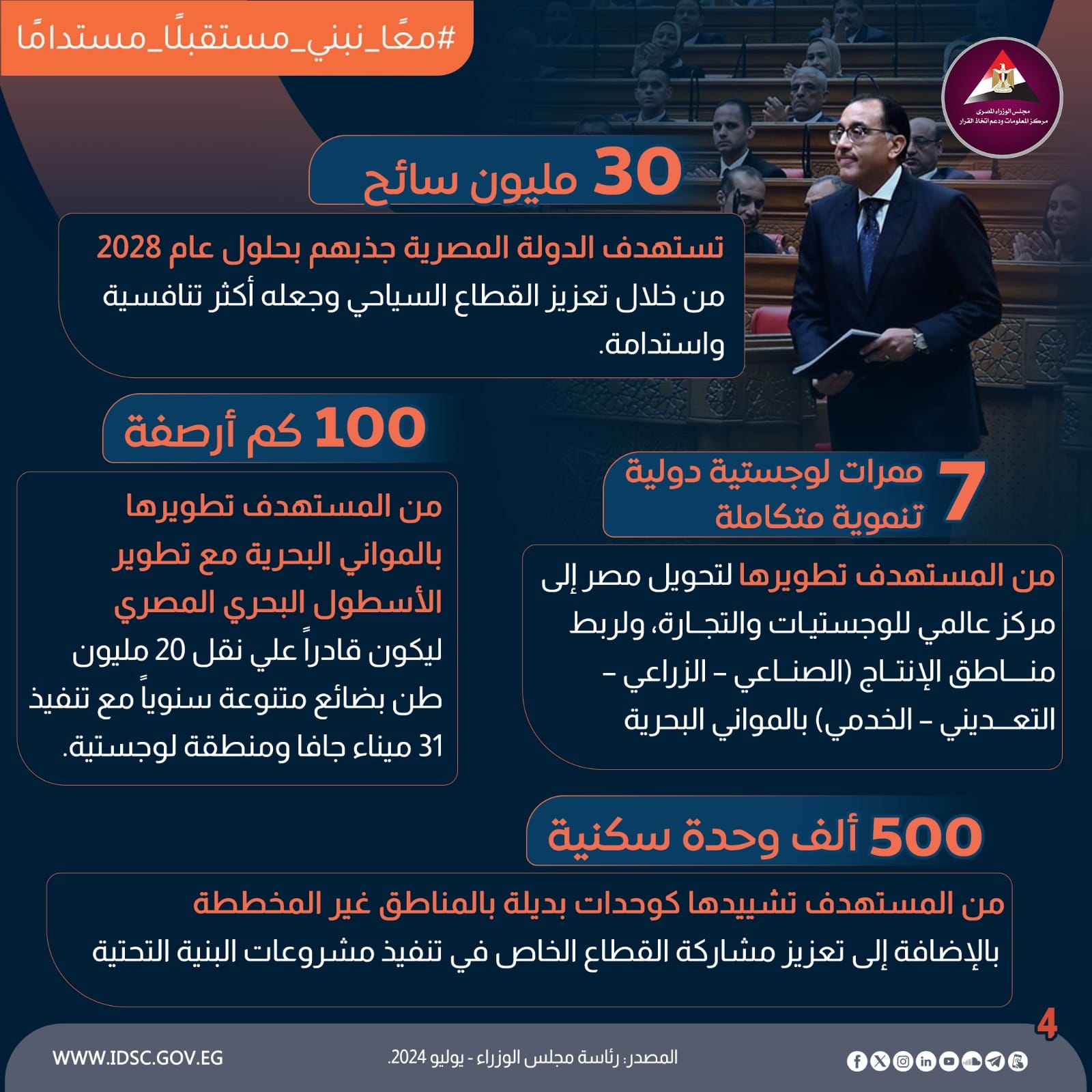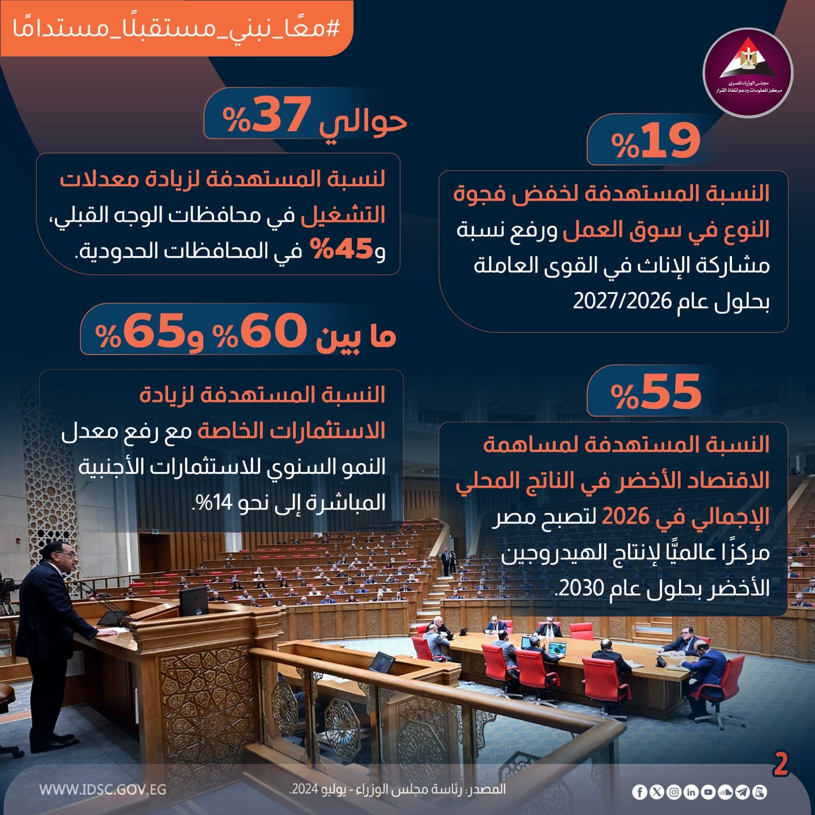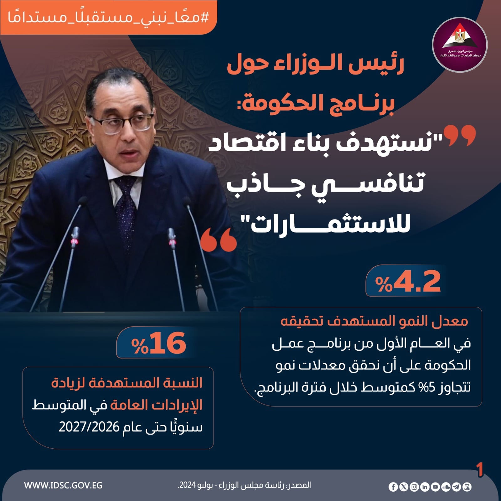 وأوضح رئيس الوزراء أن الحكومة تستهدف في العام الأول من برنامج عملها، تحقيق معدل نمو يبلغ 4.2%، على أن تحقق معدلات نمو تتجاوز 5% كمتوسط خلال فترة البرنامج، مع التحول نحو دور أكبر للقطاع الخاص في توليد الناتج وفرص العمل، وتحقيق نمو احتوائي قادر على خلق المزيد من فرص العمل اللائقة، ومواصلة دمج الاقتصاد غير الرسمي في الاقتصاد الرسمي، فضلًا عن خلق اقتصاد تنافسي قائم على المعرفة، ومنع الممارسات الاحتكارية.