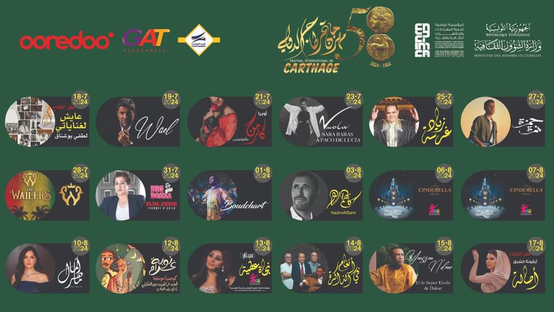أيام قليلة وتنطلق فعاليات الدورة 58 من مهرجان قرطاج الدولي، وهو مهرجان سنوي للموسيقى، يُدشن في الفترة ما بين منتصف شهر يوليو إلى منتصف شهر أغسطس من كل عام بمدينة قرطاج الساحلية في ضواحي تونس العاصمة.