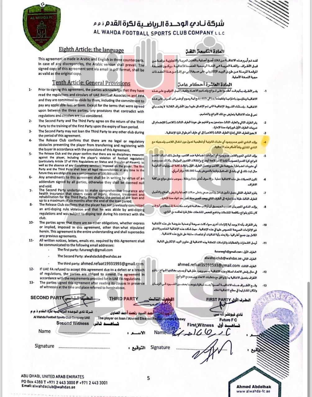 وهكذا تكشف الفقرة الرابعة أن نادى فيوتشر أقر بأن اللاعب أحمد رفعت ليست لديه أي عقبات قانونية تمنعه من الاحتراف والإعارة في النادى الإماراتى.