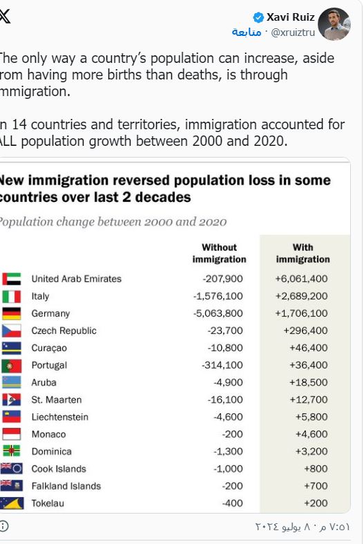 وأورد التقرير الذي نُشر أمس الاثنين، على الموقع الرسمي للمركز، أنه في 14 دولة ومنطقة، شكلت الهجرة أكثر من 100٪ من النمو السكاني خلال الفترة (2000 - 2020)، "وهذا يعني أن عدد السكان هناك كان سيتراجع لولا وصول مهاجرين جدد".