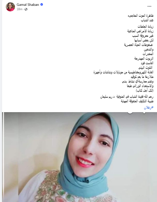 وتابع الدكتور جمال شعبان "لكل أجل كتاب.. رحم الله فقيدة الشباب في المنوفية د. ريم سليمان طبيبة التكليف المتفوقة المهذبة"