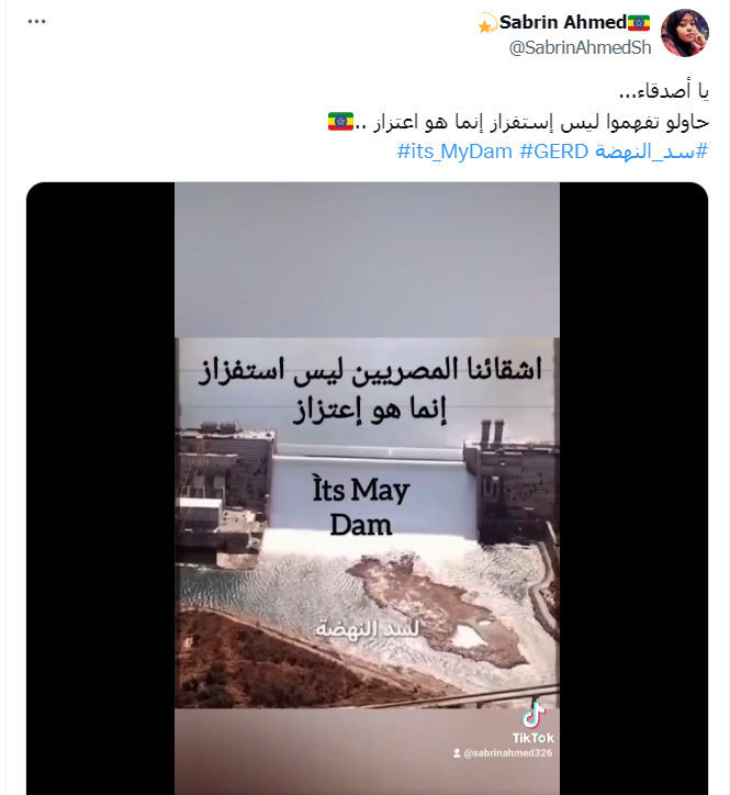وعادت نائبة رئيس المعهد الإثيوبي للدبلوماسية الشعبية صابرين أحمد إلى استفزاز المصريين مرة أخري، بعد نشرها لمقطع الفيديو الأول للملء الخامس لسد النهضة، معلقة: "يا أصدقاء... حاولو تفهموا ليس إستفزاز إنما هو اعتزاز".