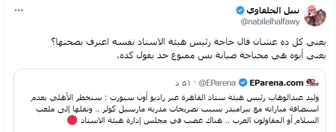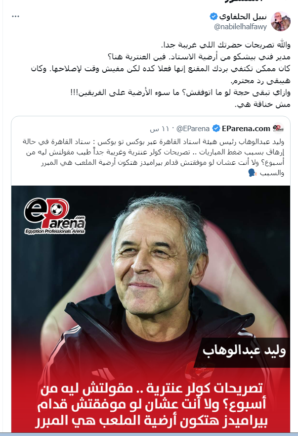 ورد نبيل الحلفاوي على حديث رئيس هيئة استاد القاهرة بإخطار الأهلي بعدم استضافة مباراته مع بيراميدز، فقال: "يعني كل ده عشان قال حاجة رئيس هيئة الاستاد نفسه اعترف بصحتها؟ يعني أيوه هي محتاجة صيانة بس ممنوع حد يقول كده."