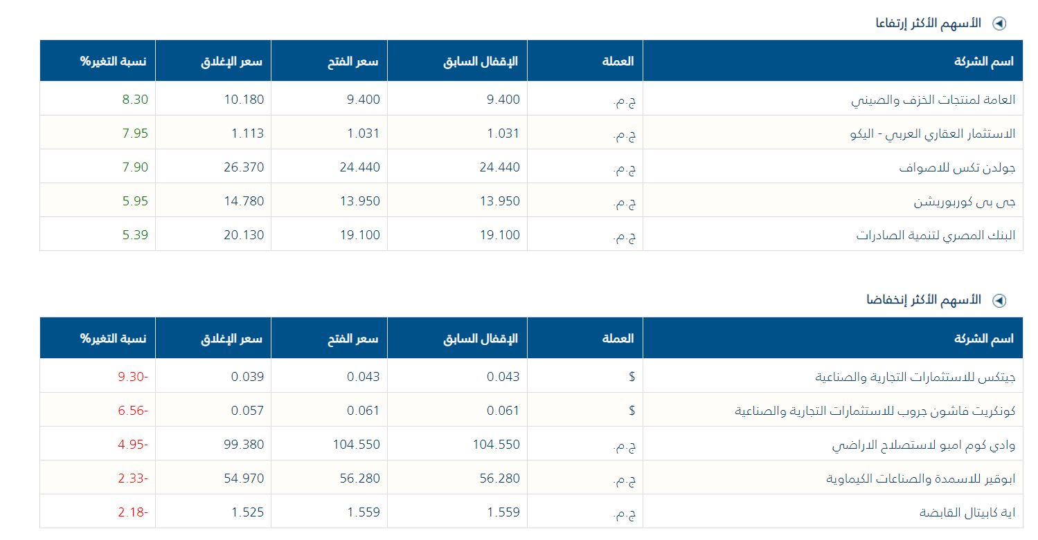 البورصة المصرية، الأسهم الأكثر ارتفاعا وانخفاضا بمنتصف تعاملات اليوم