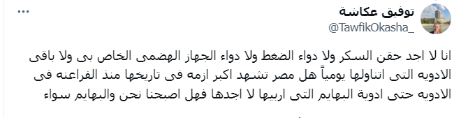 نقص الأدوية، عبر الإعلامي توفيق عكاشة عن غضبه، لعدم توافر الأدوية التي يتناولها يوميًا، وأطلق استغاثة عبر حسابه بمنصة "أكس"، مؤكدًا على نقص العديد من الأدوية في السوق المصري.