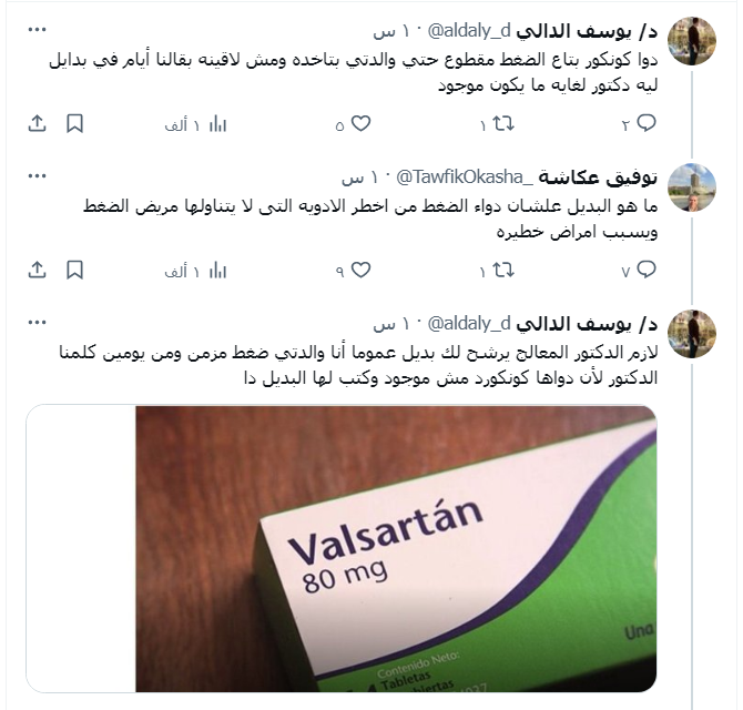 فعلق عليه أحد متابعي د. يوسف الدالي قائلًا: " دوا كونكور بتاع الضغط مقطوع حتى والدتي بتاخده ومش لاقينه بقالنا أيام في بدايل ليه دكتور لغاية ما يكون موجود".