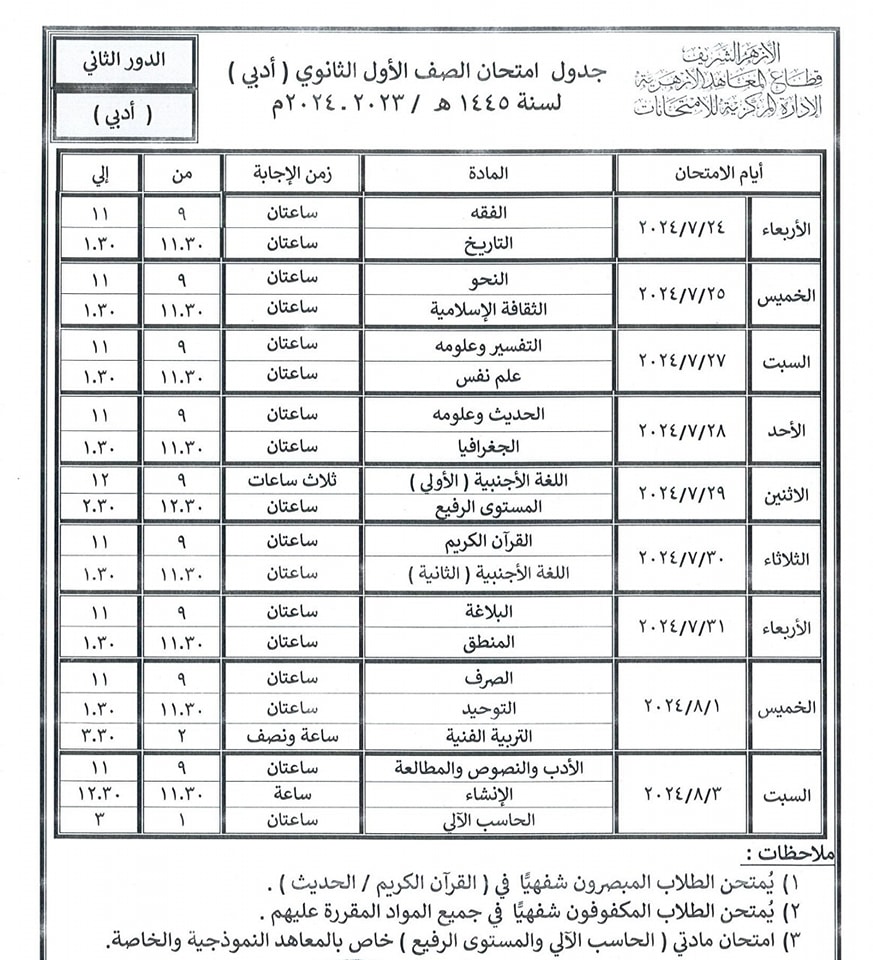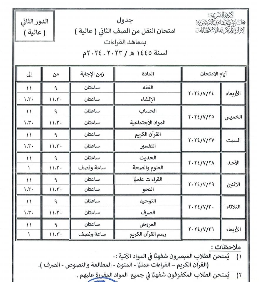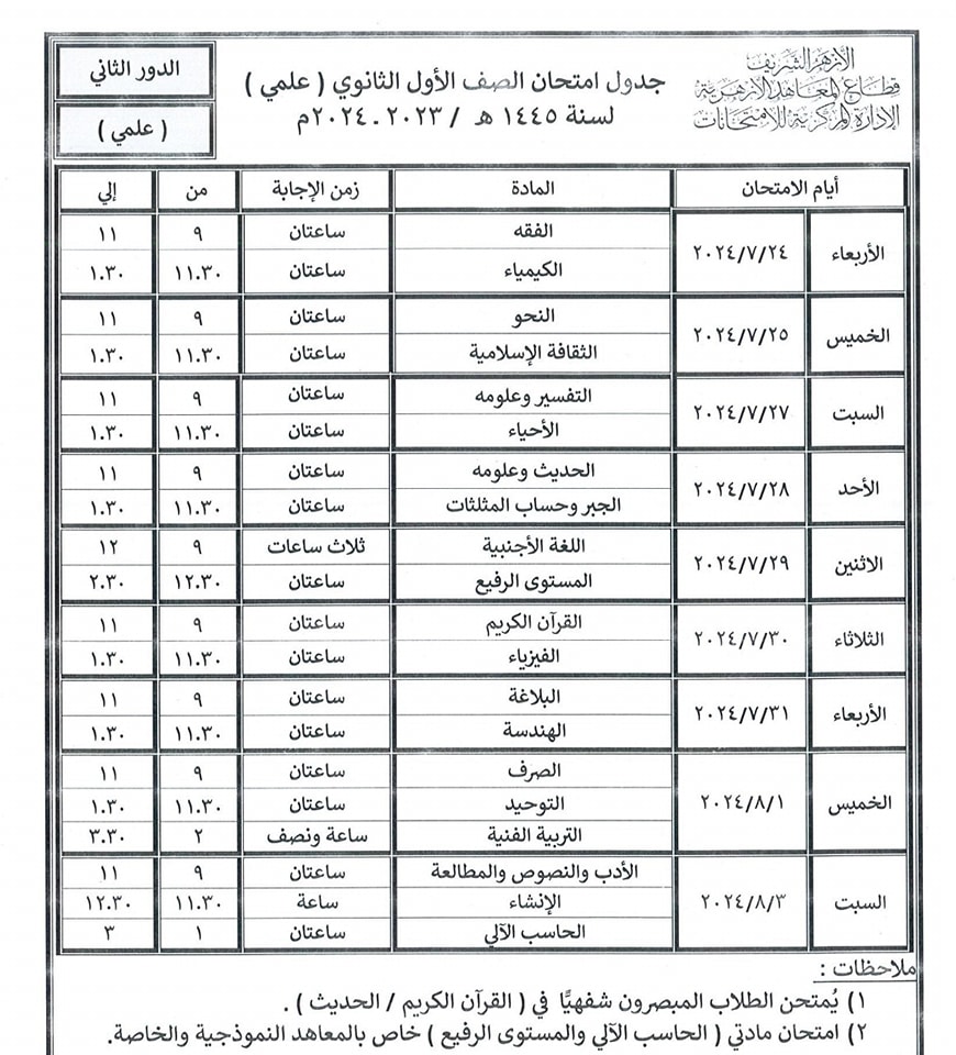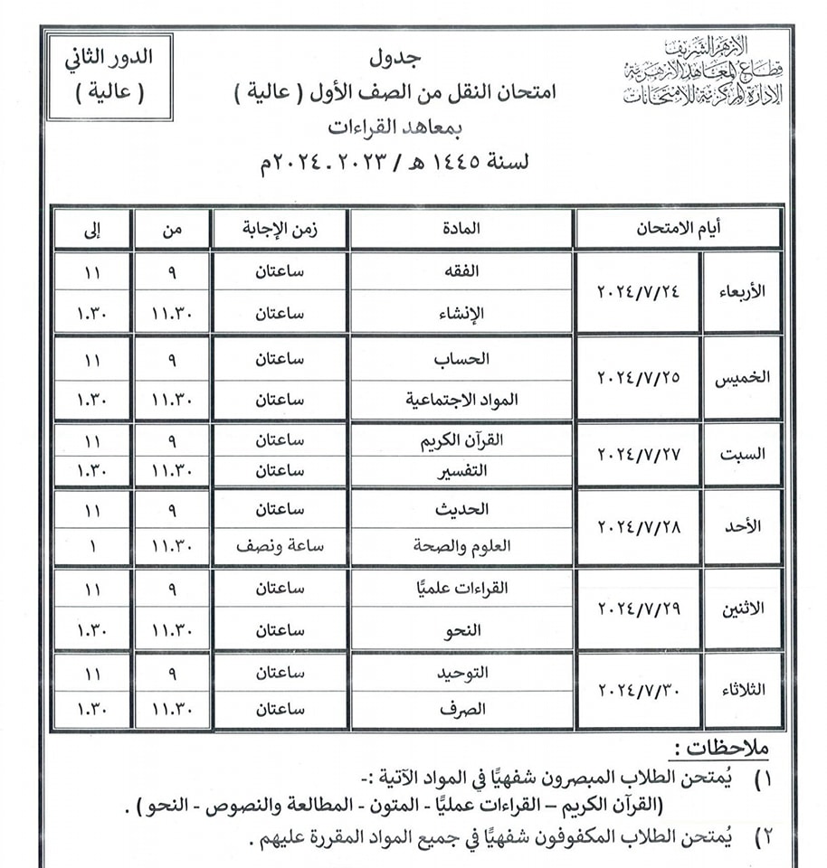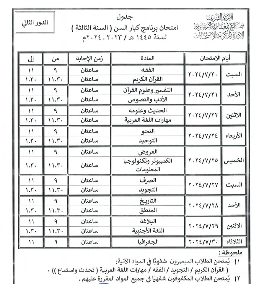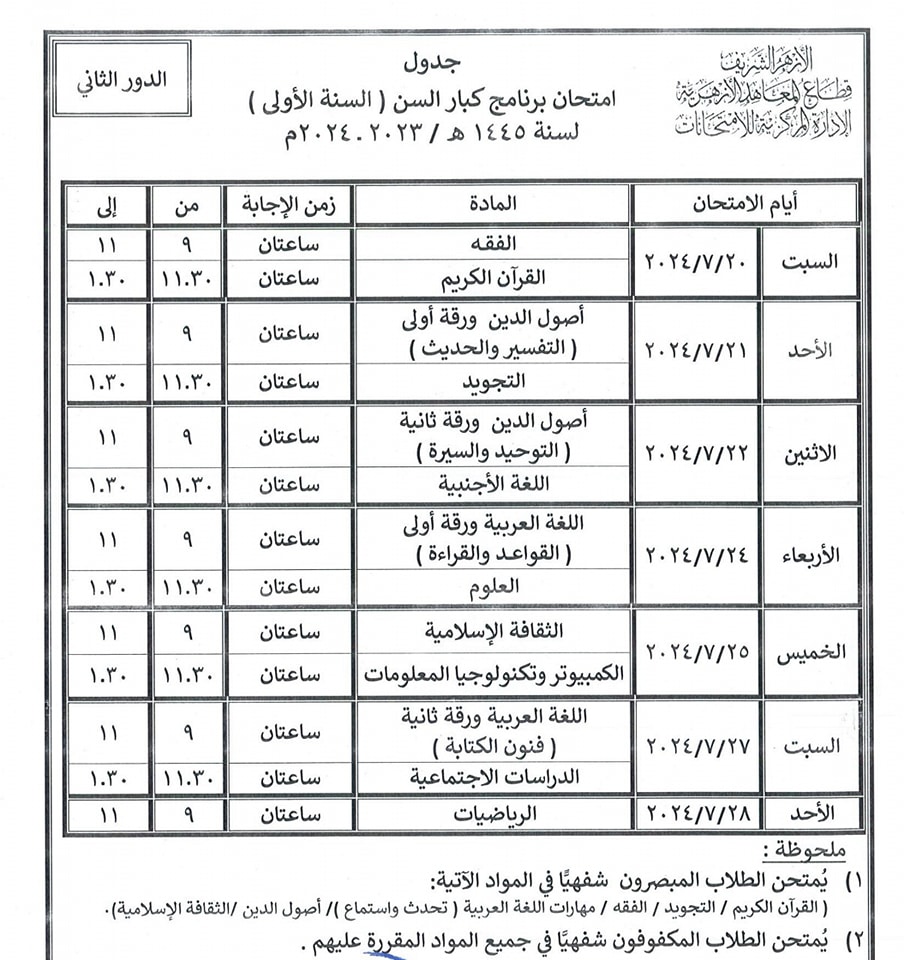 الأزهر يعلن جدول امتحانات الدور الثاني لصفوف النقل في جميع المراحل (صور)