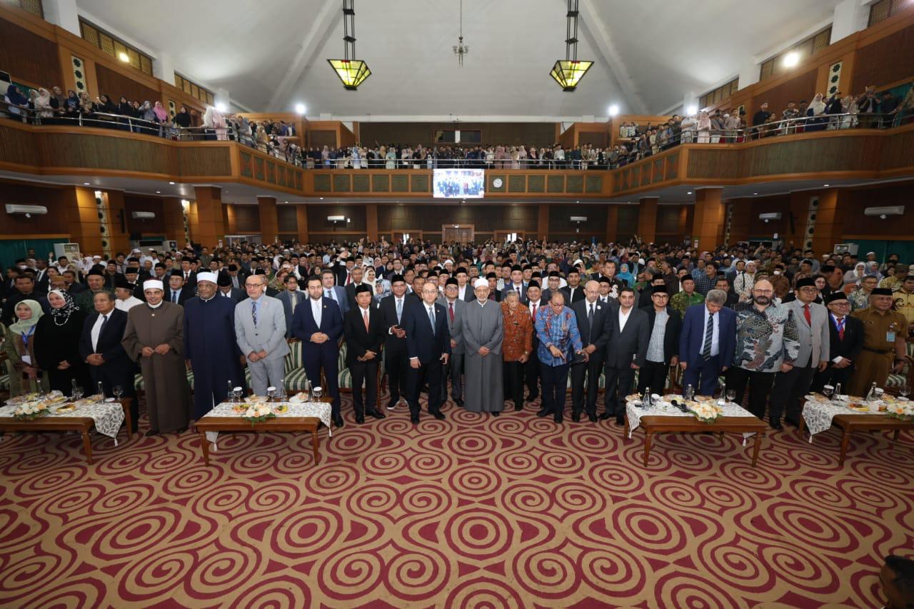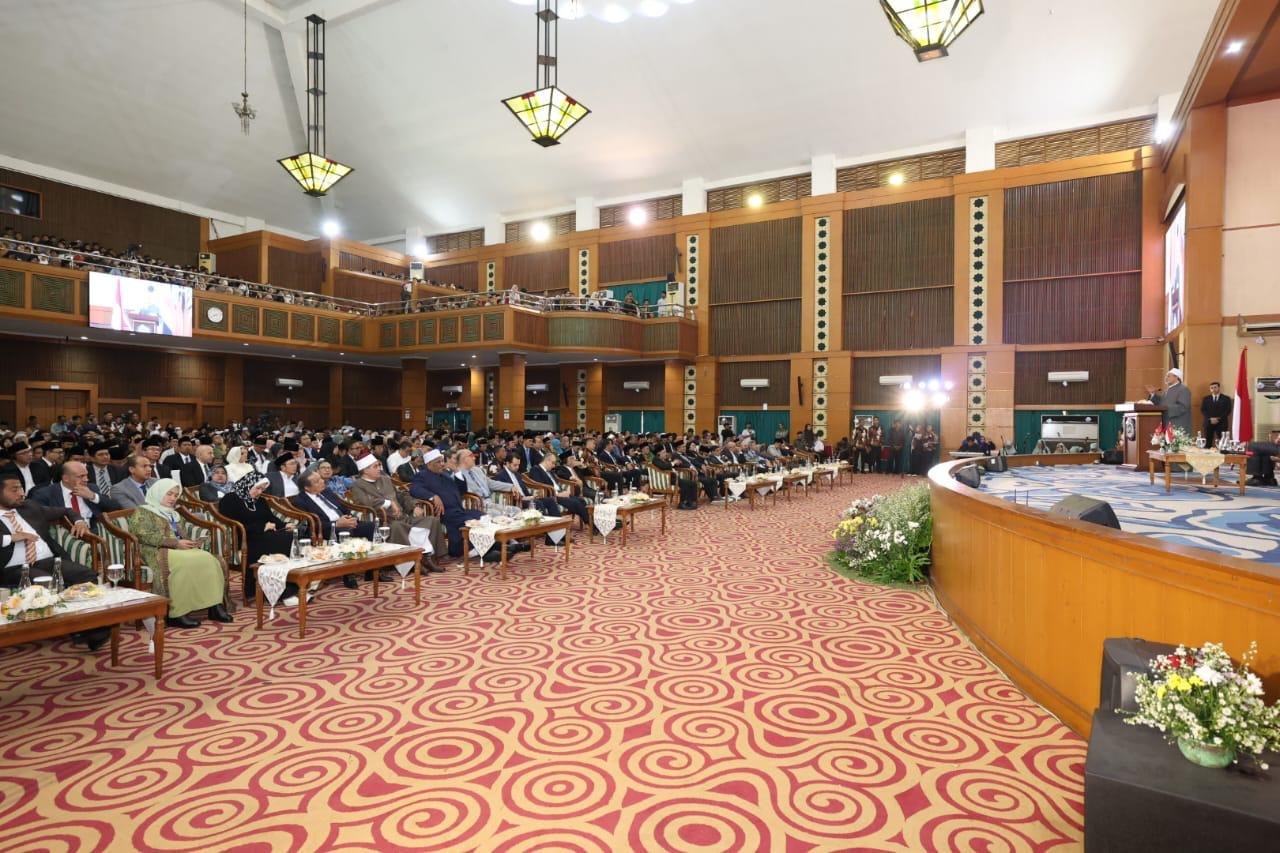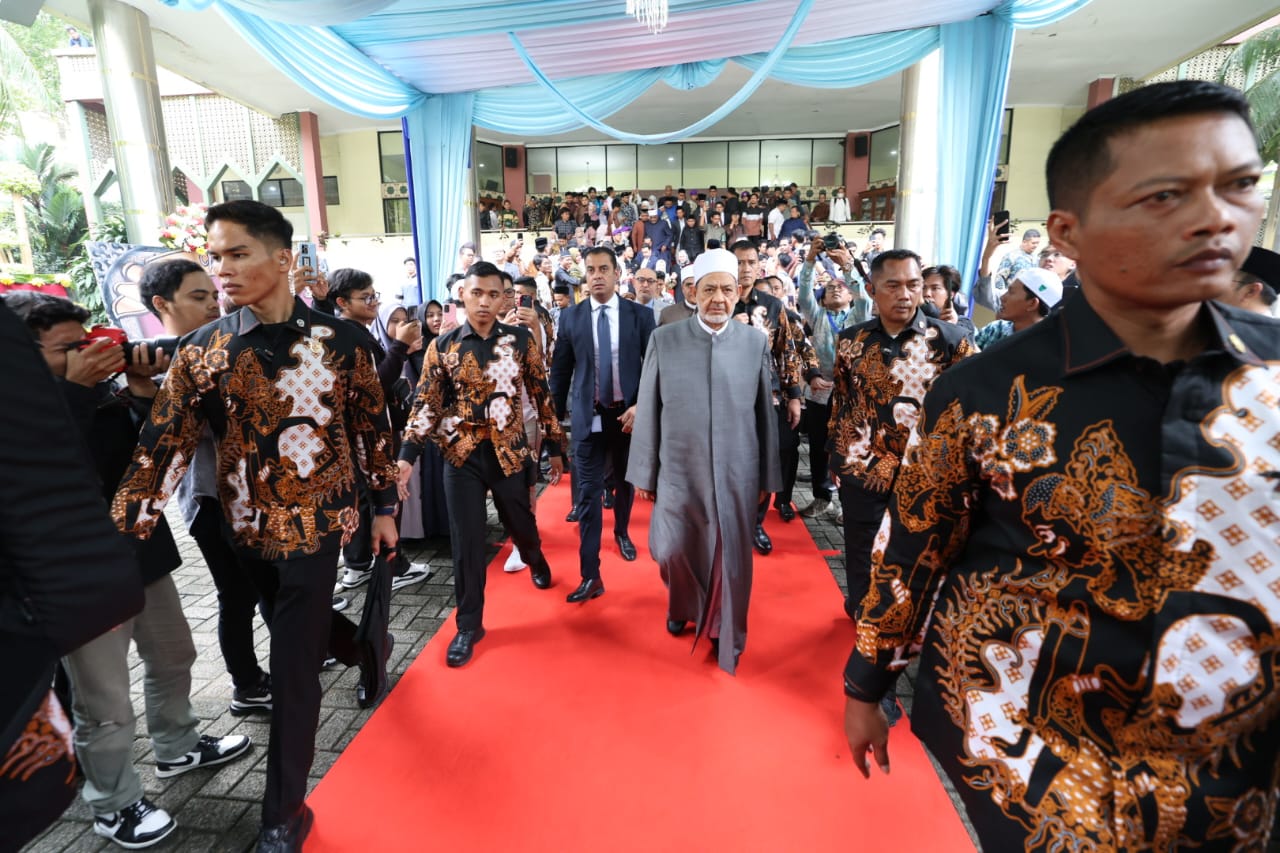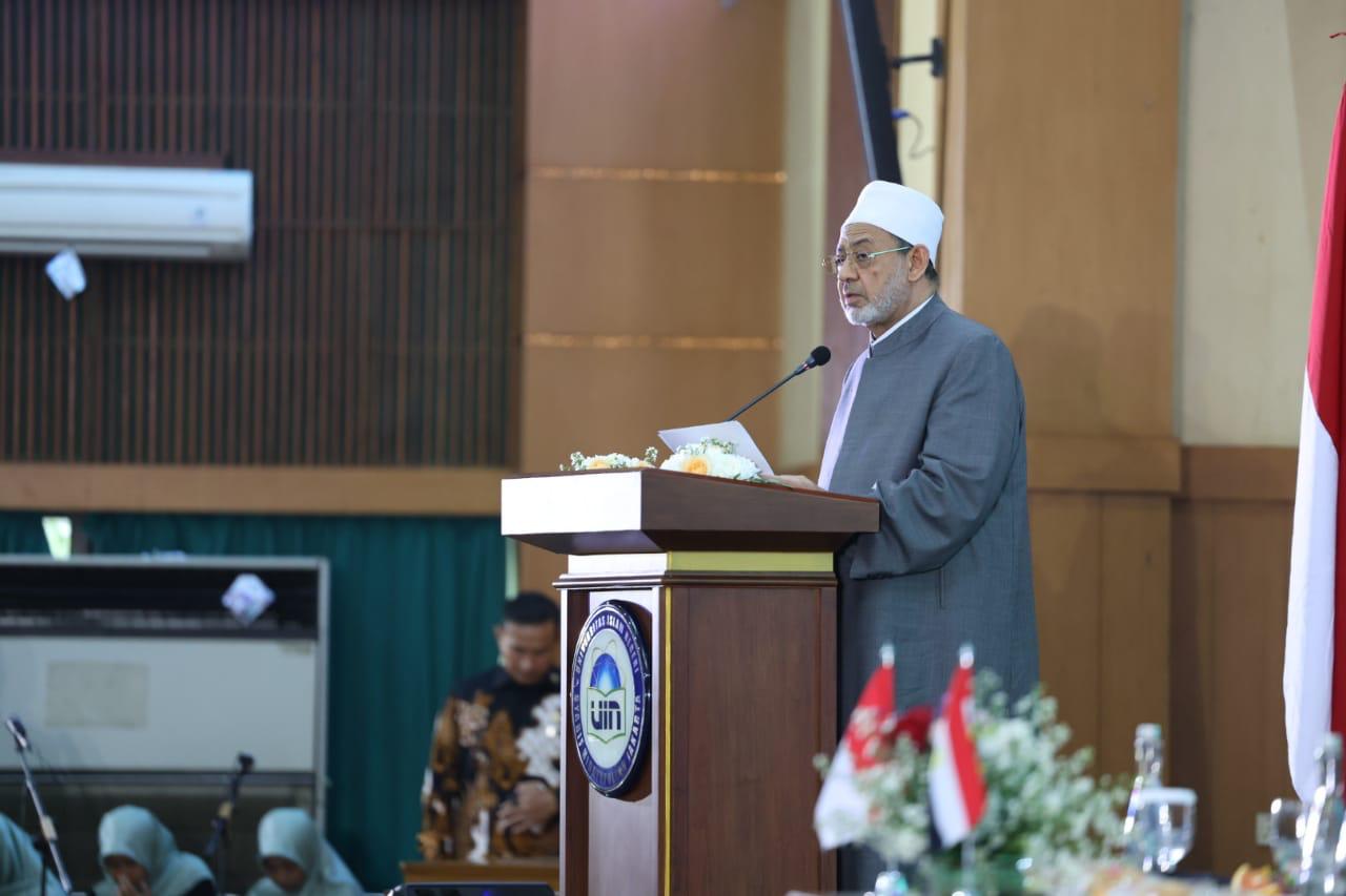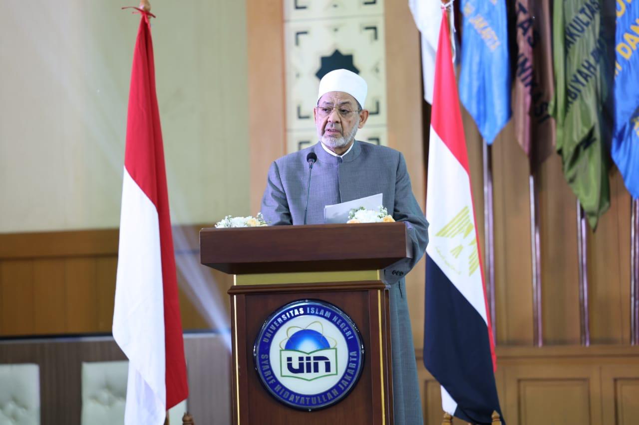 عقدت جامعة شريف هداية الله الإسلامية الحكومية بجاكرتا، لقاءً جماهيريًّا لفضيلة الإمام الأكبر أ.د أحمد الطيب، شيخ الأزهر الشريف، رئيس مجلس حكماء المسلمين، اليوم الثلاثاء، بمناسبة زيارة فضيلته لإندونيسيا، وذلك بحضور أساتذة الجامعة وباحثيها والطلاب الإندونيسيين من مختلف الجامعات، وعدد من الوزراء والسفراء ورؤساء المؤسسات الدينية، وذلك تحت رعاية السيد جوكو ودودو، رئيس جمهورية إندونيسيا.